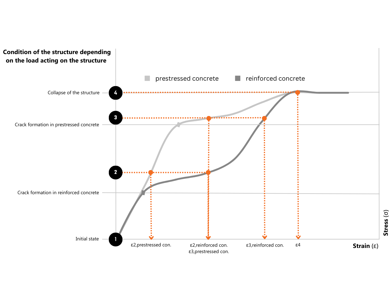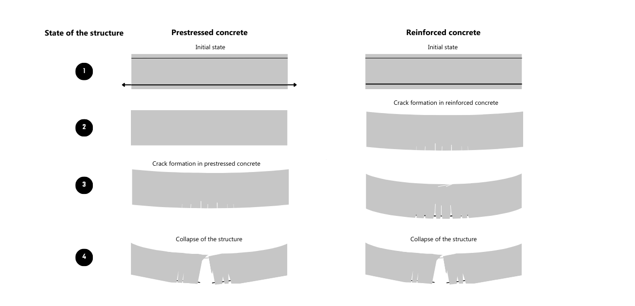 Durch das Vorspannen fügen wir dem Beton eine Druckspannung hinzu, die das Verhalten des Materials erheblich verändert. Die Rissbildung verzögert sich, da die Spannungsreserve der ersten Belastung standhält. Bei anderen Laststufen erreicht Beton einen Dekompressionszustand. Später hält der Beton Spannungen stand, bis die Zugfestigkeit überschritten wird.