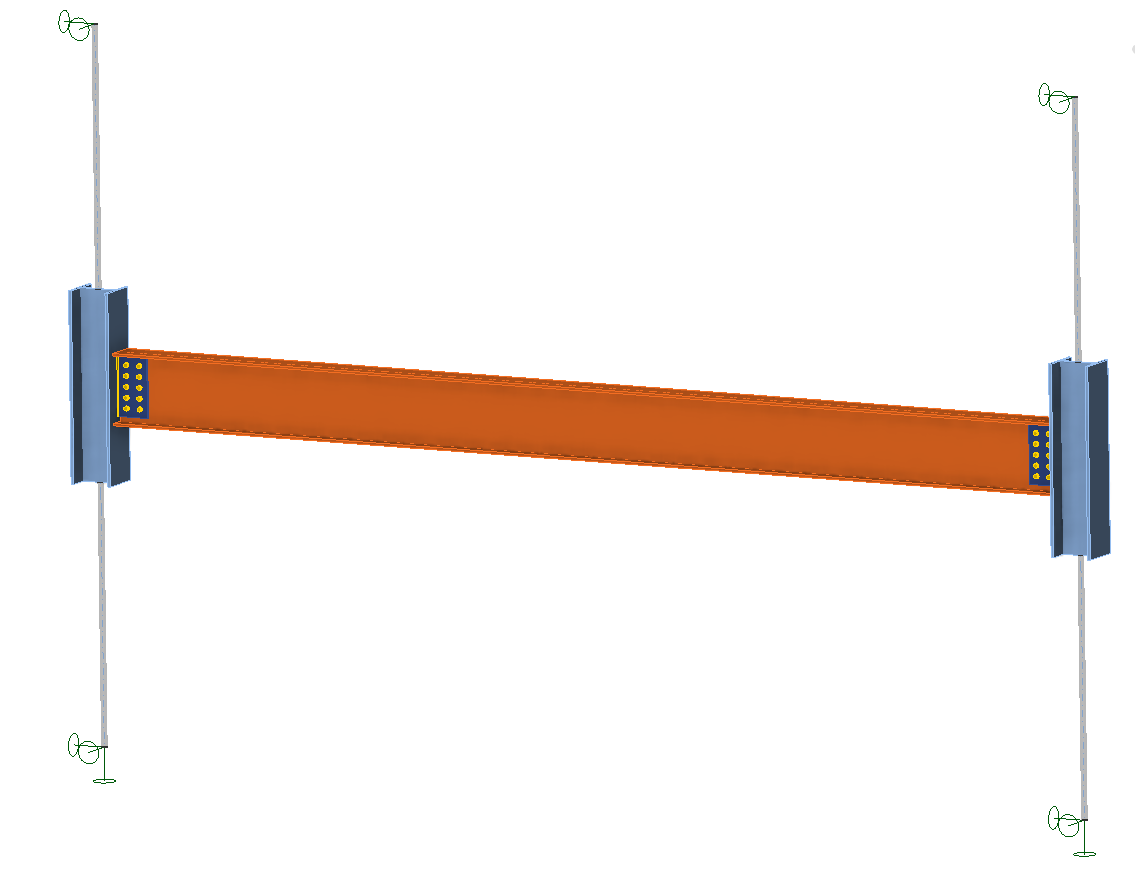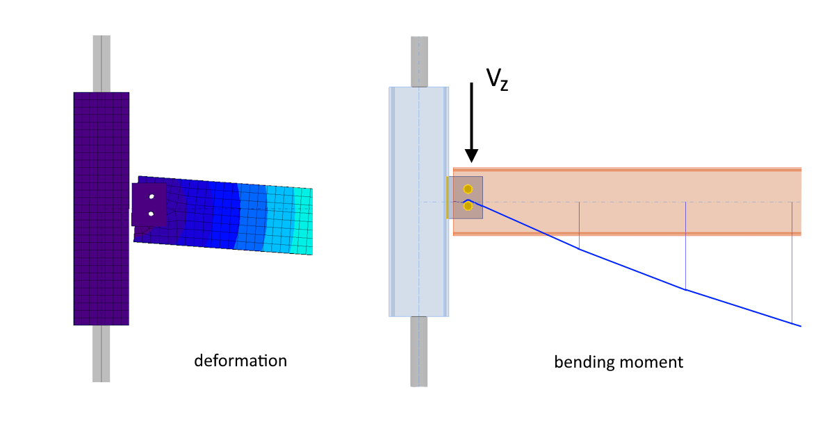 Wenn die Verbindung als gelenkig eingestuft wird und eine ausreichende Rotationskapazität aufweist, kann die Vereinfachung des kleinen Biegemoments, das von der Verbindung übertragen wird, vernachlässigt werden. Die Verteilung der Schnittgrößen in der Verbindung kann dann wie bei einer Verbindung vom Typ A berücksichtigt werden. Entscheidet sich der Ingenieur, die Verbindung ohne diese Vereinfachung zu entwerfen, oder wird die Verbindung als semistarr eingestuft, muss die berechnete Rotationssteifigkeit der Verbindung in das globale Analysemodell einbezogen werden. Das Biegemoment in der Verbindung wird dann berechnet und die Verbindung wird mit der Connection App auf Scherung und Moment überprüft.