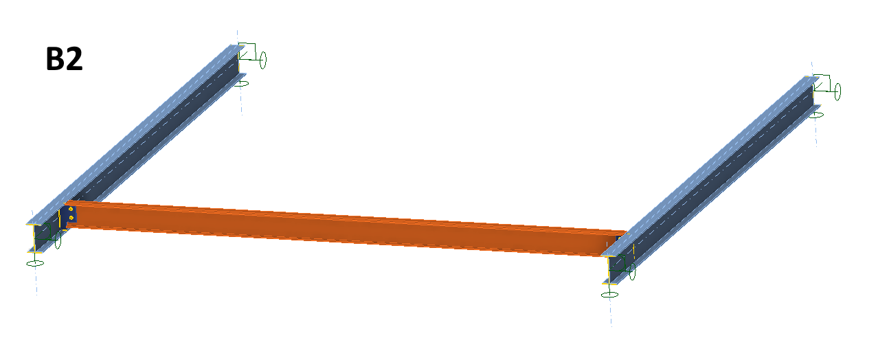 Betrachten wir das zweite Beispiel für eine Scherverbindung. Verbindung B ist ein weiterer Typ einer einfachen Scherverbindung, die häufig in Stahlkonstruktionen verwendet wird. In diesem Fall wird der I-Träger mit dem senkrecht dazu stehenden Stützbalken mit dem I-Abschnitt verbunden. Typischerweise kann dies ein Anschluss eines Deckenträgers an den Randträger sein. Es wird angenommen, dass die Decke selbst nicht aus einer starren Bodenplatte besteht. Außerdem werden die horizontalen Bewegungen des oberen Flansches des Balkens oder die Verdrehung des Trägerprofils nicht eingeschränkt. Der Balken ist an den Enden gegen Torsion abgestützt. Die Torsionsnachgiebigkeit des Balkens führt jedoch dazu, dass sich das Verhalten von Verbindung B im Vergleich zu Verbindung A deutlich unterscheidet.