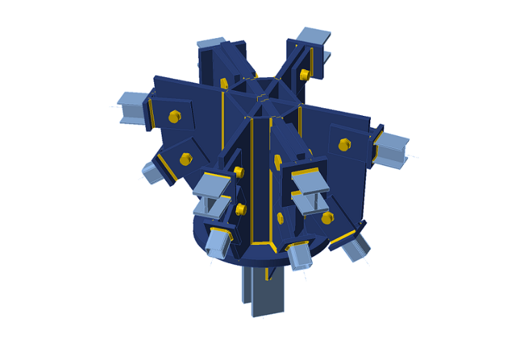 Zu diesem Zweck musste Kiernan Steel den mechanischen Zugang und die Ausrüstung in und um ihre Verbindungen zulassen. Daher war es entscheidend, dass die Verbindungen nicht nur so klein wie möglich waren – sondern auch Präzision bei der Bemessung und Konstruktion dieser Bauteile von größter Bedeutung war. Insbesondere an den Knotenverbindungen, wo mehrere auskragende Fachwerke auf einen einzigen Punkt zusammenlaufen.