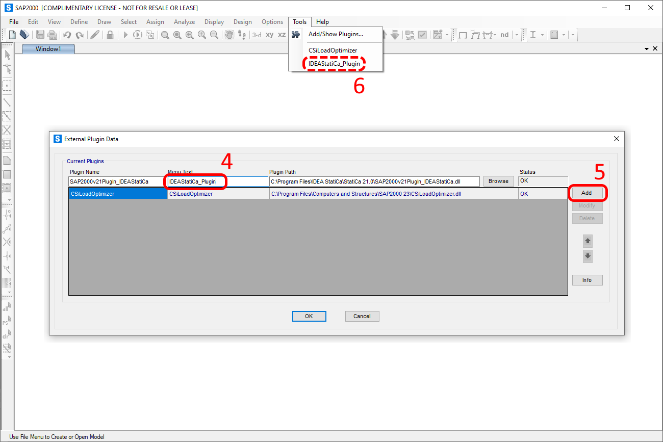 - Starten Sie SAP2000 und gehen Sie auf die Karte Tools, wo wählen Sie Plugins... hinzufügen/zeigen(1)