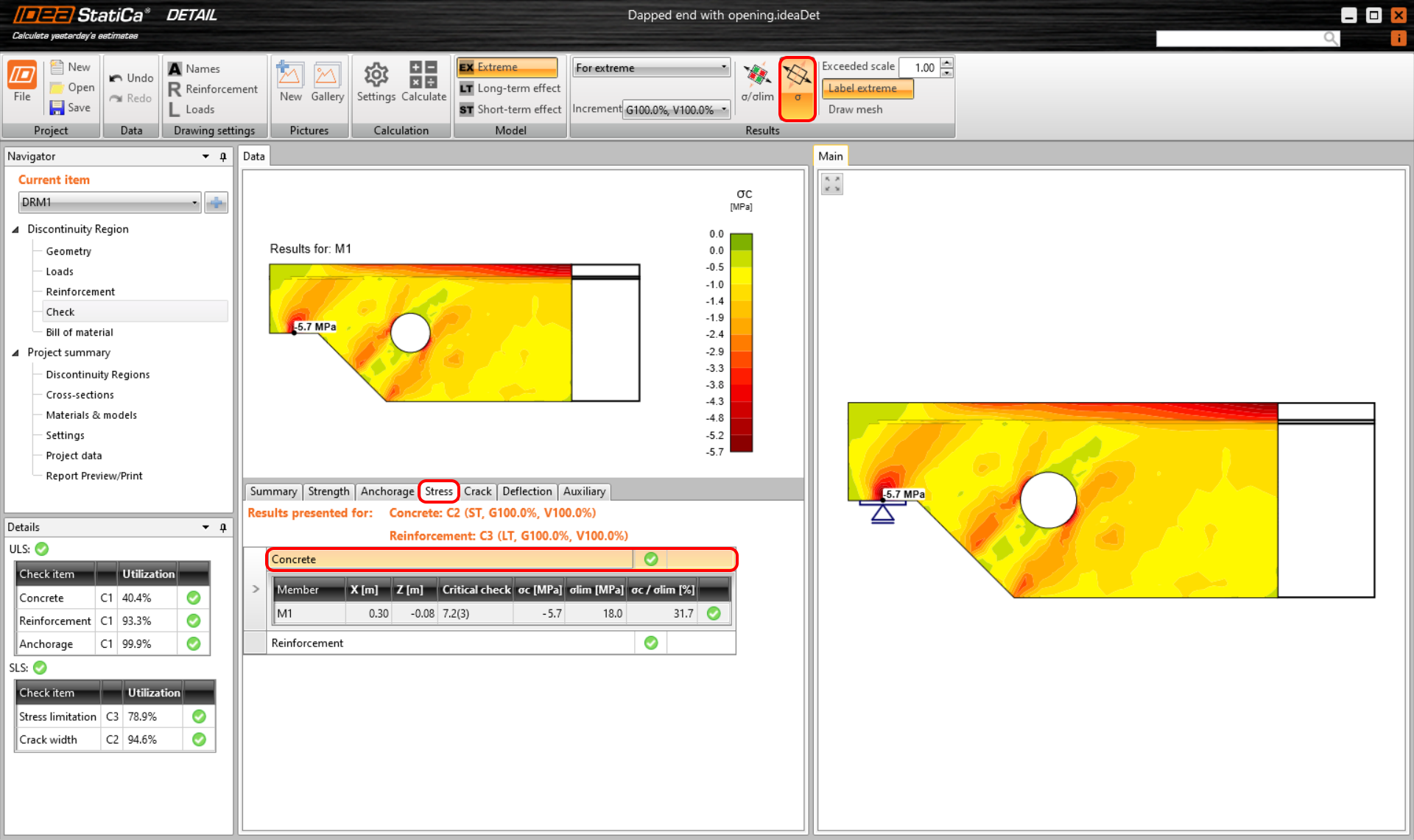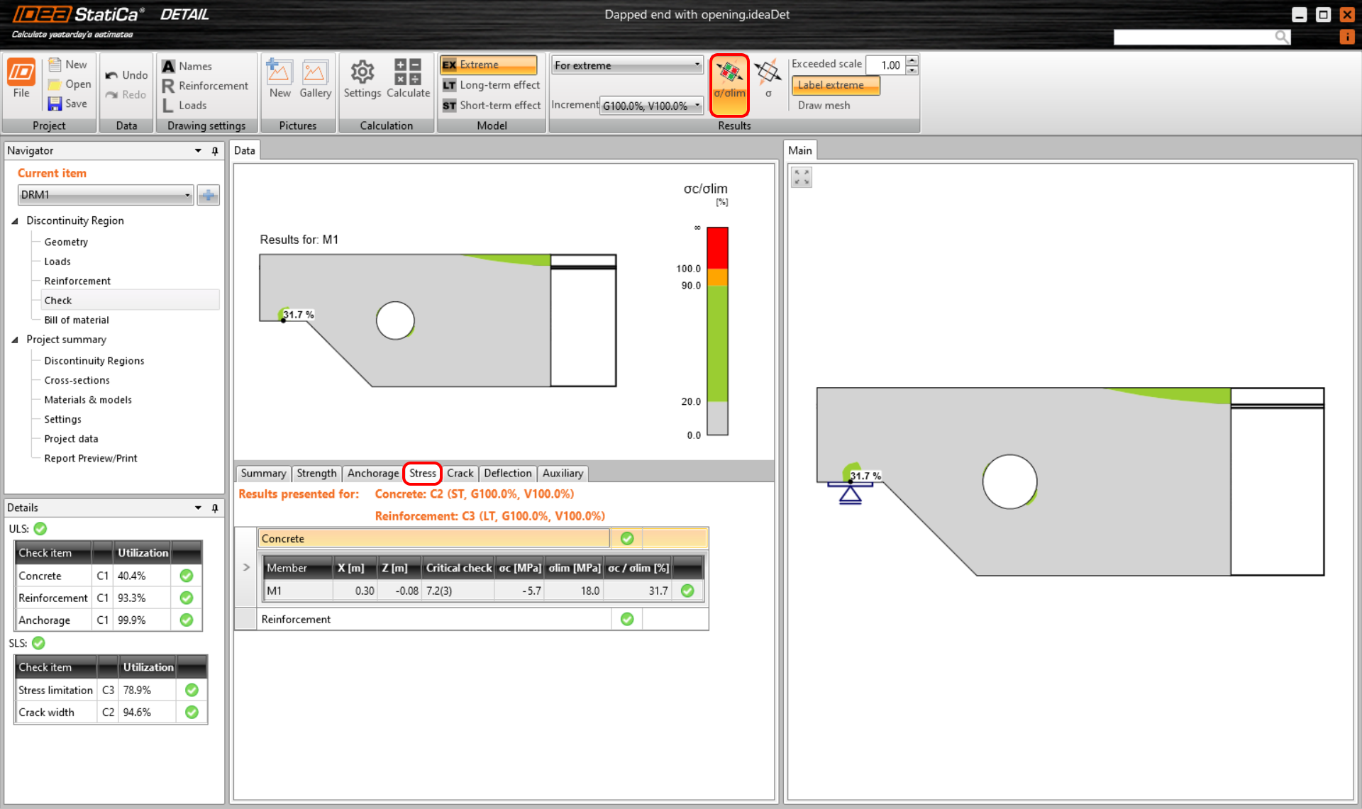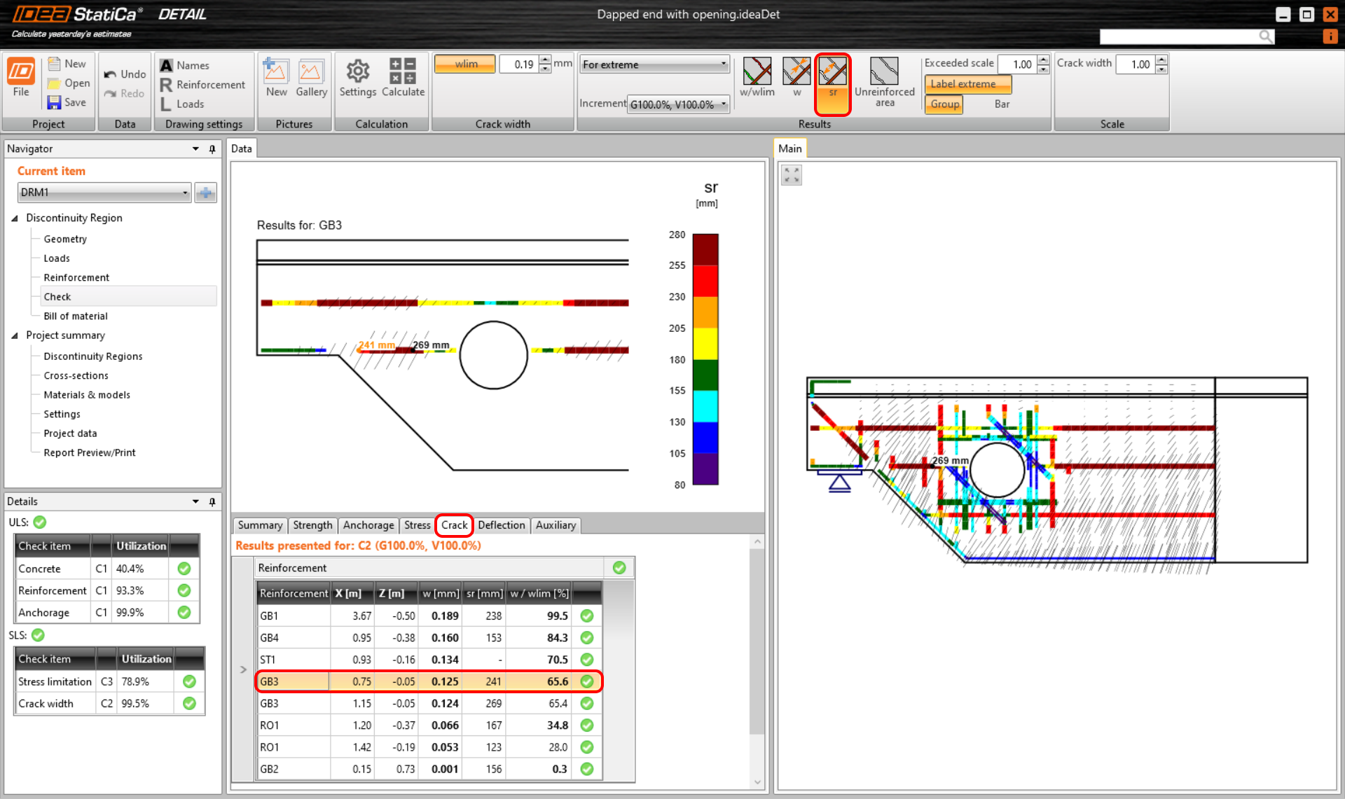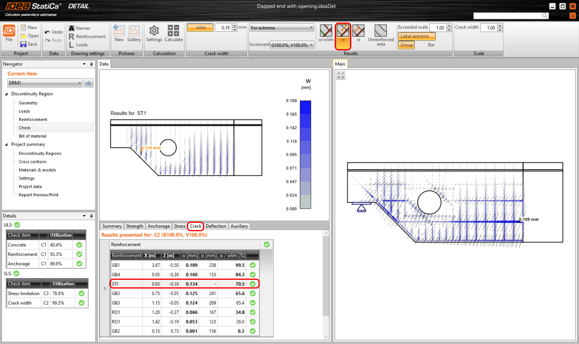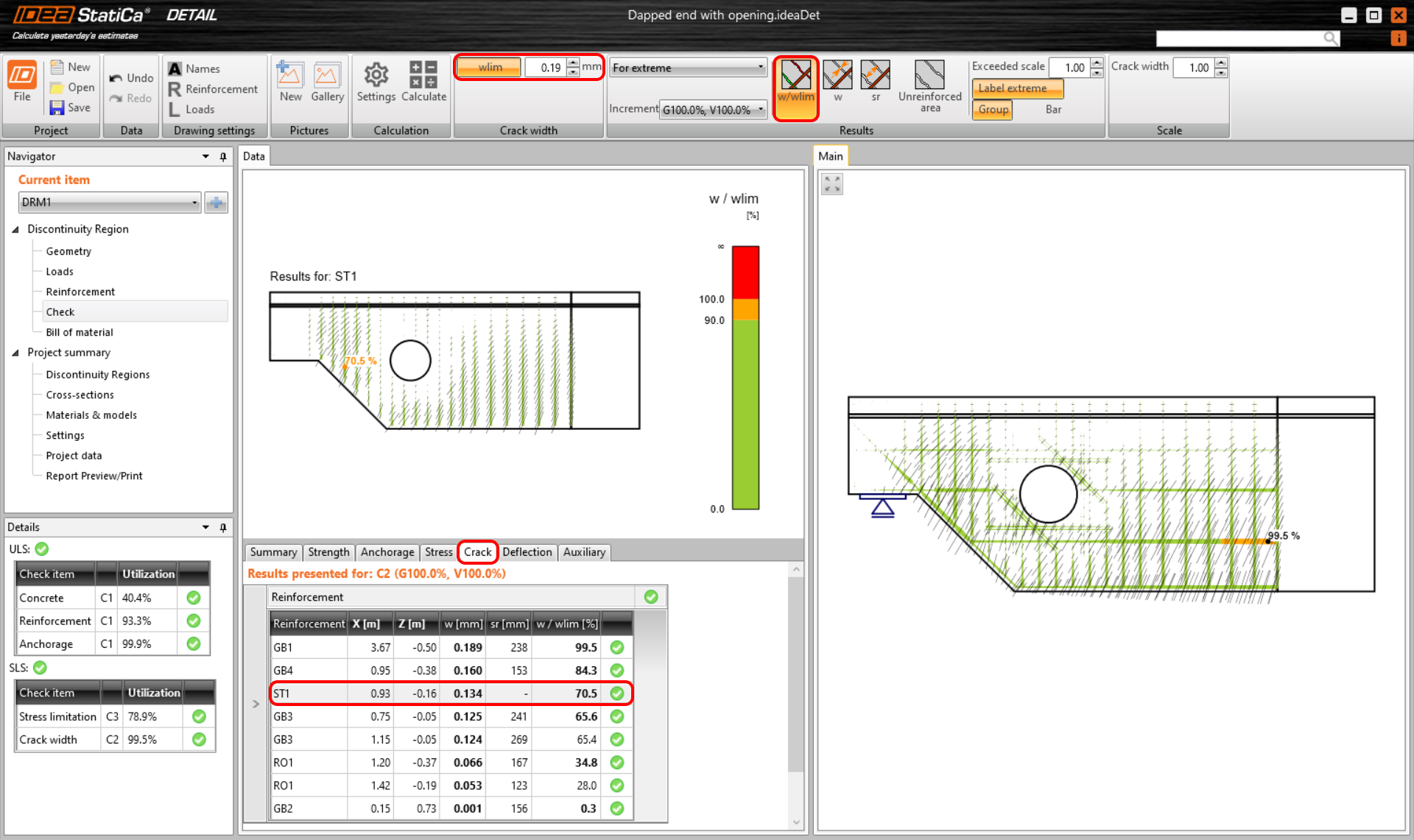 Der Grenzwert wlim kann im oberen Menüband eingestellt werden. Standardmäßig ist wlim = 0,3 mm nach Eurocode eingestellt. Die Ergebnisse werden wieder farblich unterschieden (grün/orange/rot), so dass die Nachweise auf den ersten Blick erkennbar sind.