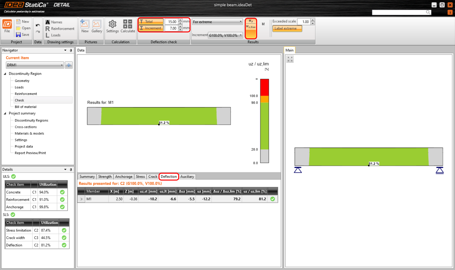 Schließlich ist es möglich, neben der Anzeige der Durchbiegung auch einen Durchbiegungsnachweis durchzuführen. Sie können zwischen zwei Nachweisen wählen - Zuwachs und Gesamt.
