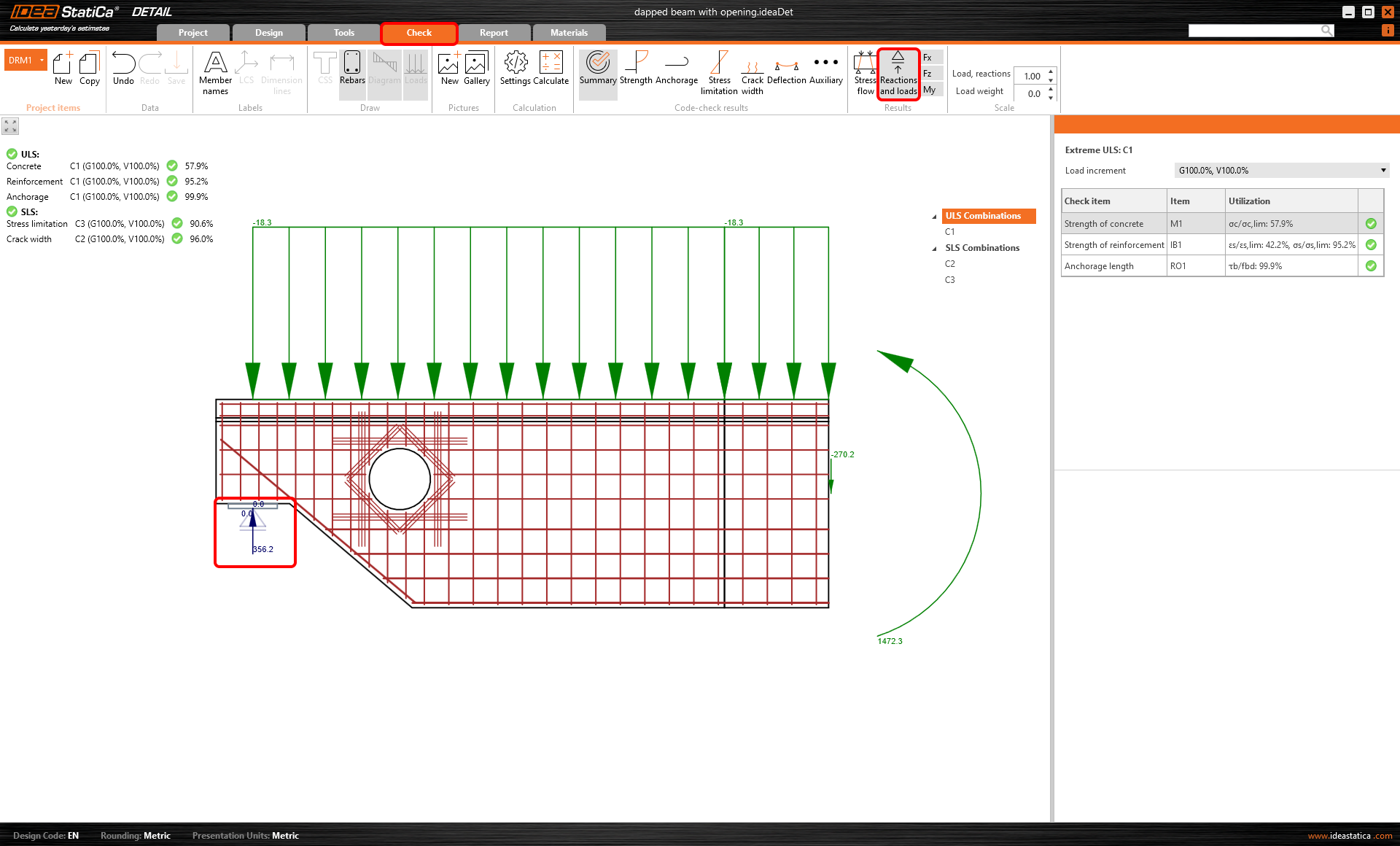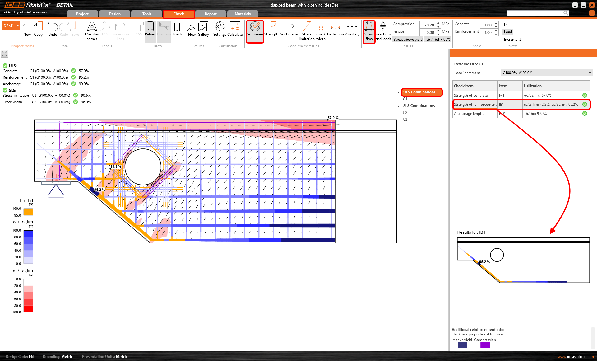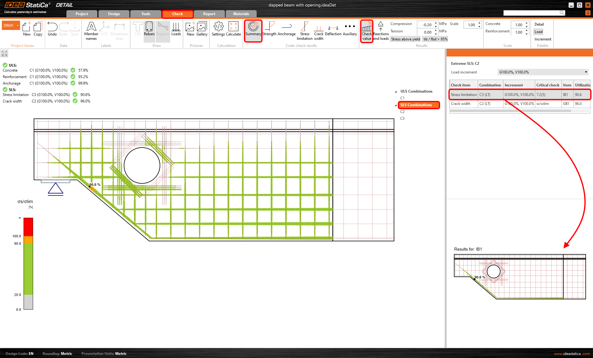 Für SLS-Nachweise können Sie auch eine Zusammenfassung der Ergebnisse anzeigen. Klicken Sie auf SLS und sehen Sie die Werte für Spannungsbegrenzung und Rissbreite.