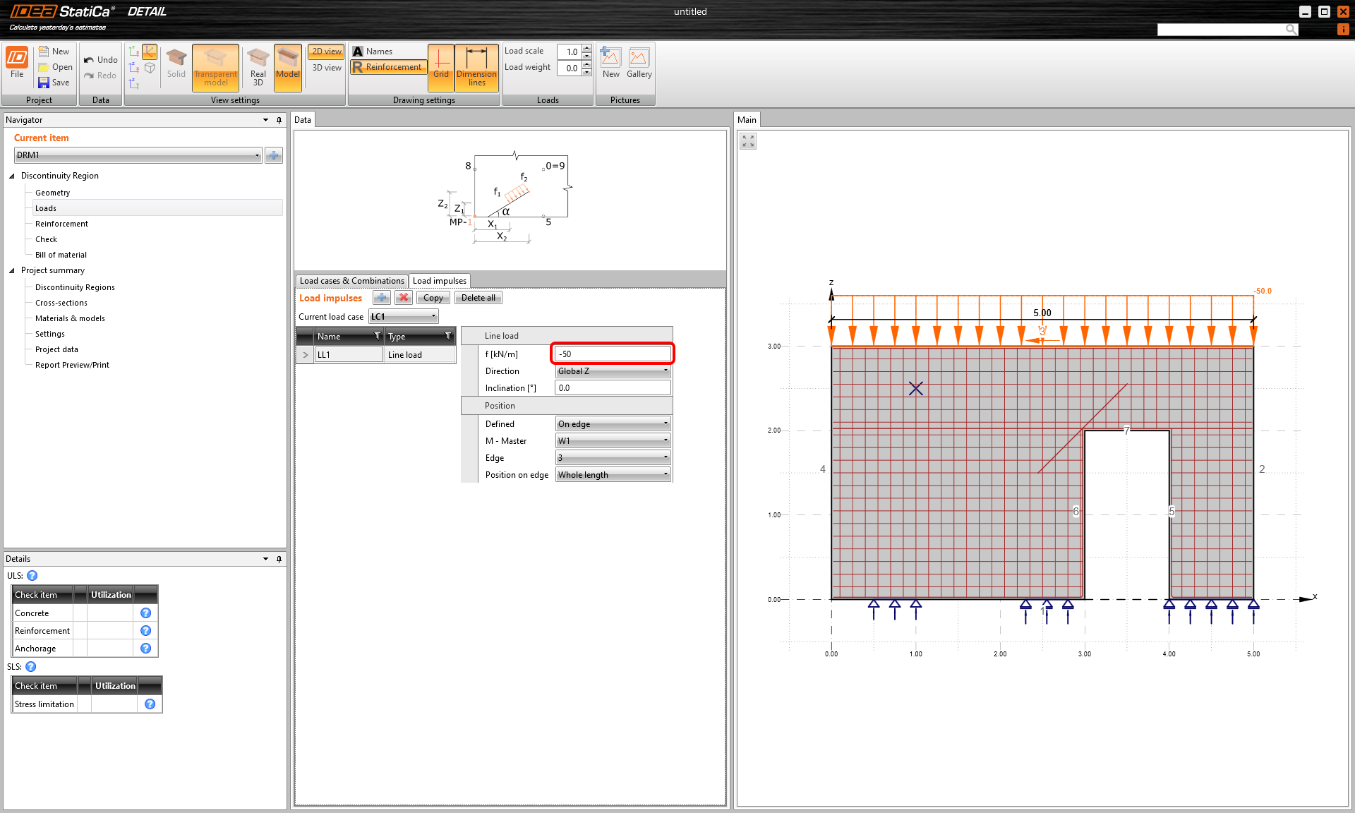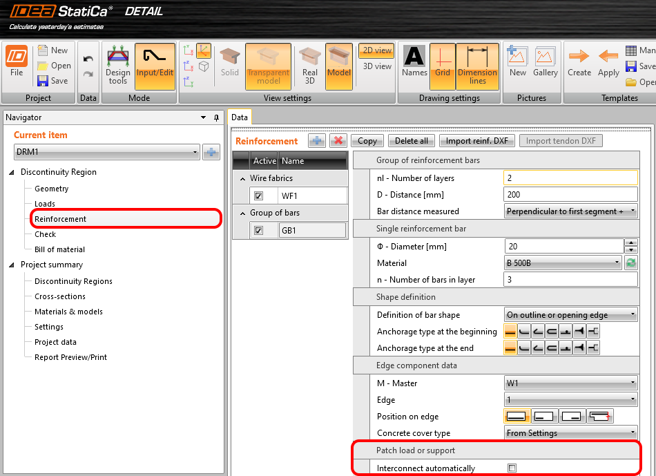 Die Flächenlast kann von der Software automatisch an die angrenzende Bewehrung angeschlossen werden. Dazu müssen Sie jedoch das Kontrollkästchen für die entsprechenden Stäbe im Abschnitt Bewehrung aktivieren.