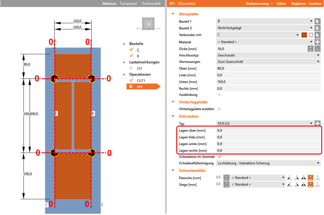 Die Positionierung der Schrauben in die einzelnen Richtungen (oben/unten/links/rechts) erfolgt durch die Verschiebung vom Nullpunkt, der sich aus den Schnittpunkten der o.g. Grenzflächen des Querschnitts ergibt.