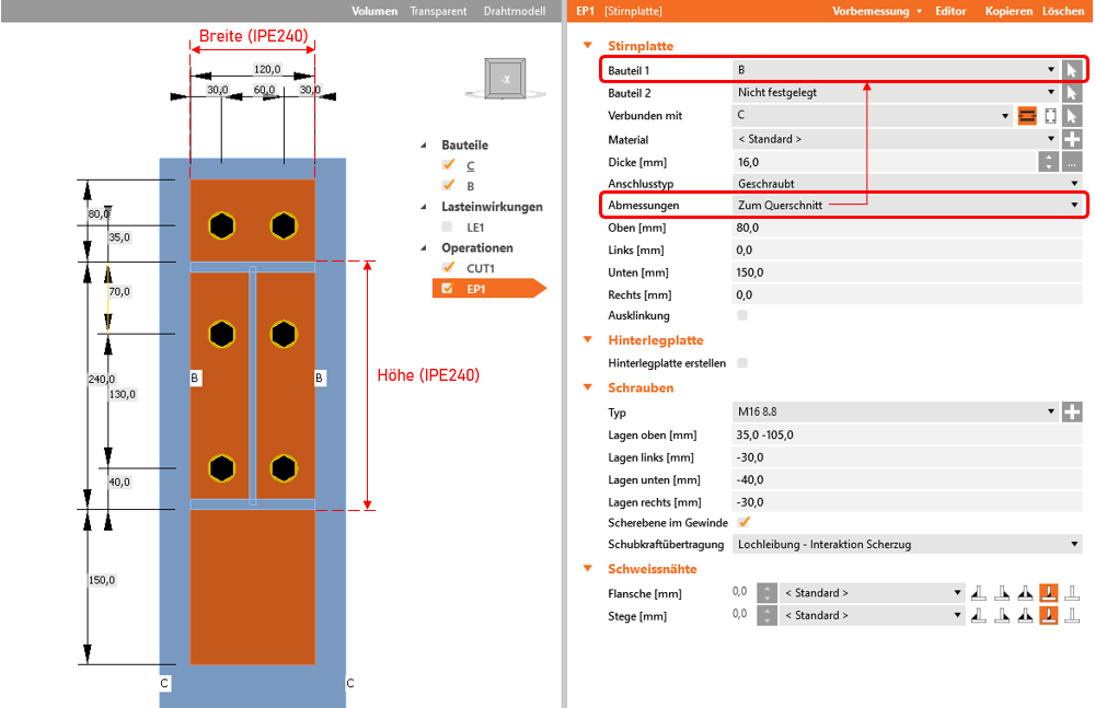 Die Einstellung "Abmessungen" legt fest, mit welchem Bezug die Abmessungen gewählt werden. Zum Querschnitt definiert die rechteckige Form der Stirnplatte durch die Höhe und die Breite des Querschnitt des anzuschließenden Bauteils (Bauteil 1).