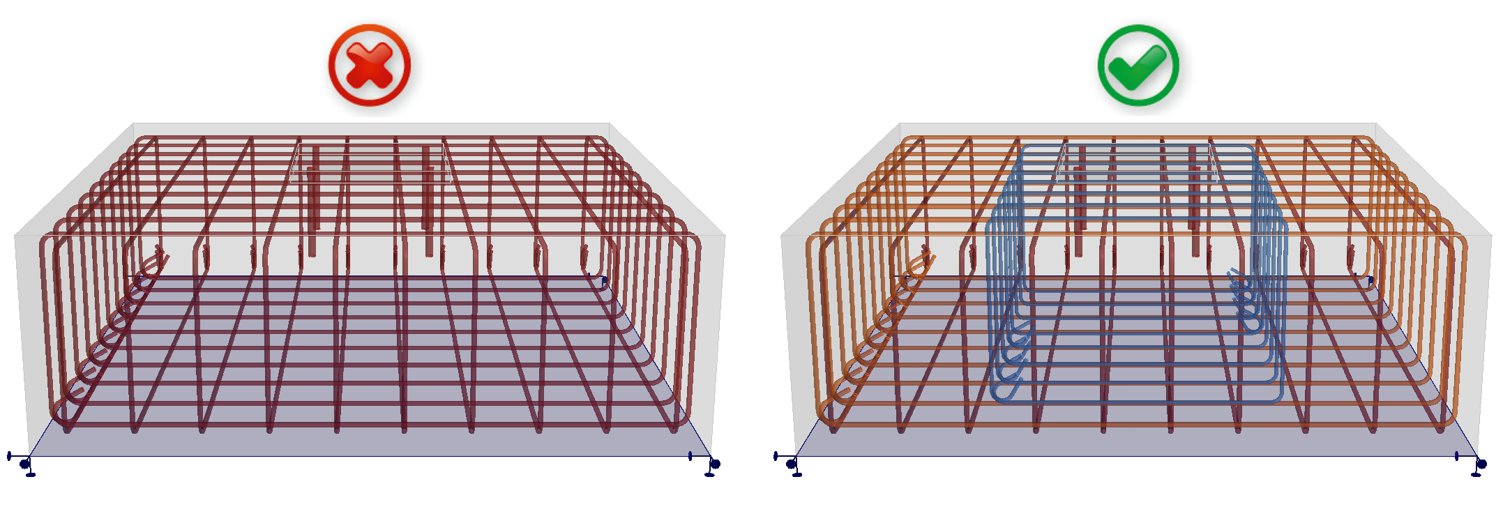 Sie müssen also Bauwerke modellieren, die den Anforderungen der in den Normen definierten Detaillierungsregeln entsprechen, insbesondere dem maximalen Abstand der Bewehrungsstäbe. Das linke Modell enthält keinen Bügelschenkel im Volumen um die Anker. Das Modell wird zwar erfolgreich berechnet, aber die Ergebnisse können irreführend sein, da der maximale Abstand der Bügelschenkel bei weitem nicht erfüllt ist. Beim rechten Modell hingegen ist diese Regel erfüllt und die Ergebnisse sind korrekt.