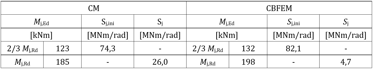 The rotational stiffness calculated by CBFEM is compared with CM. The comparison shows good agreement in initial stiffness and correspondence of joint behavior. The calculated stiffness from CBFEM and CM are summarised in Tab. 10.1.3.
