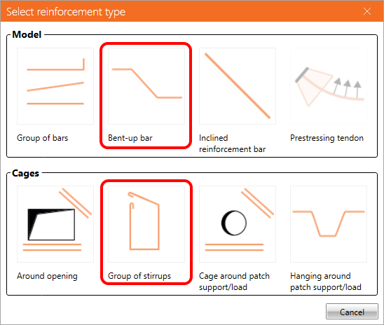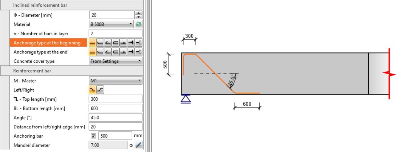 Geneigte Stäbe wie diese werden üblicherweise anstelle von Bügeln verwendet, um Scherkräften standzuhalten. Durch ihren Winkel sind sie effektiver als Bügelbewehrung. Die nach oben gebogenen Stäbe können nur auf Balkengeometrietypen angewendet werden.