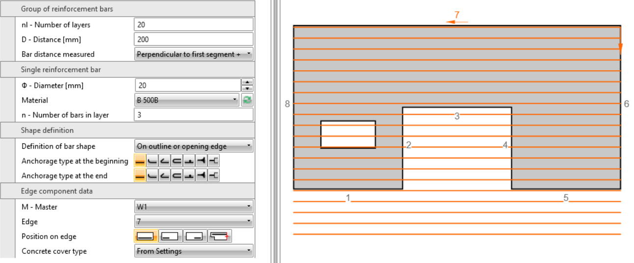 Abschließender Hinweis: Wenn Sie die Bewehrung durch die Öffnung oder über die Kanten modellieren, werden die Stäbe automatisch von der Software geschnitten. In der ersten Abbildung sehen Sie die Definition der Balkengruppe.