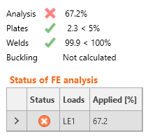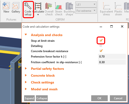 Um herauszufinden, welcher der schwächste Teil eines Anschlusses oder einer Verbindung ist und als erster versagt, bietet IDEA StatiCa die Funktion Bis zum Grenzwert rechnen, die in den Normeinstellungen aktiviert werden kann. Diese Funktion stoppt den Iterationsprozess der Finite-Elemente-Analyse, wenn eine der Normnachweise den Grenzwert erreicht. In diesem Fall wird nur ein gewisser Prozentsatz der eingegebenen Last angewendet.