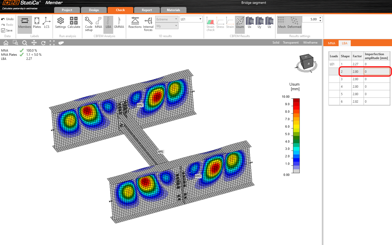 You have to go through all provided buckling shapes and decide which one is the most critical one. IDEA StatiCa considers the first buckling shape the most critical one. According to EN 1993-1-1, the local imperfections are calculated for the analyzed member. IDEA StatiCa recommends studying the materials about the imperfections.