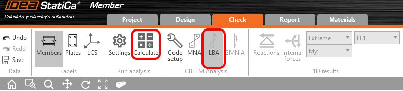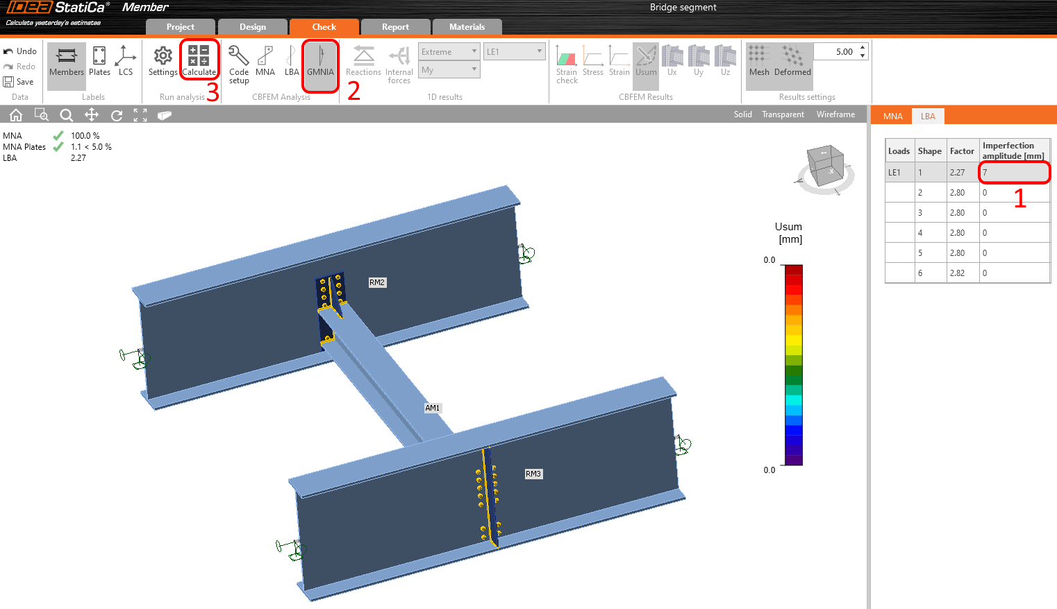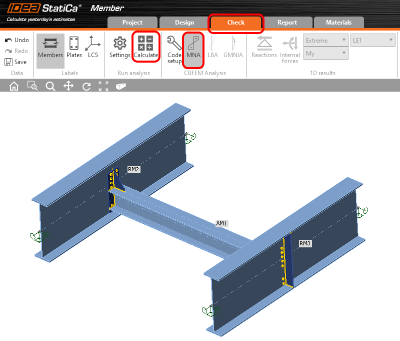 The check can be performed now. You can proceed to the Check tab. We have to perform the MNA analysis first, then LBA and at the last step, the GMNIA analysis can be performed. This order must be followed. Calculate the MNA.