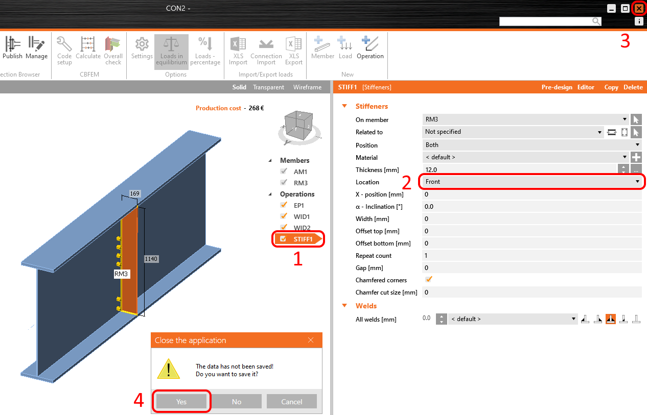 As you can see, the stiffener is generated incorrectly. So click on Edit connection, select the stiffener and change the Location to Front. Then you can close the window and don't forget to save it.