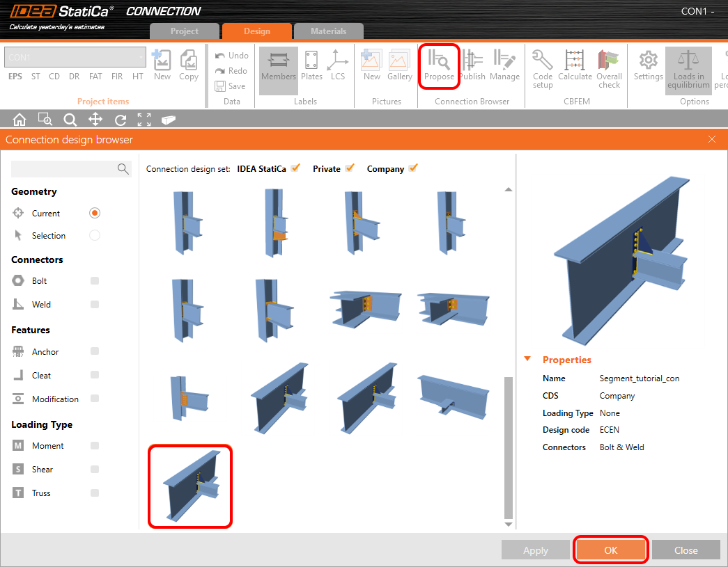 Click on Propose in the Connection Browser tab and choose Segment_tutorial_con. This pre-defined connection is saved in the IDEA StatiCa Connection design set. Please note that you have to have the newest version installed to be able to find the connection in the set. If you don't have the connection in your IDEA StatiCa set, you can just download the file attached to this tutorial, publish the connection to your Private set, and consequently Propose the connection from your Private set to the tutorial project.