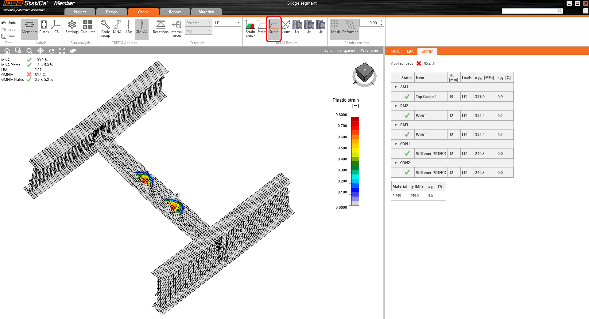 The GMNIA results are provided and you can see, that not all of the load can be applied. You can see the plastic strain of the top flange of the cross beam.