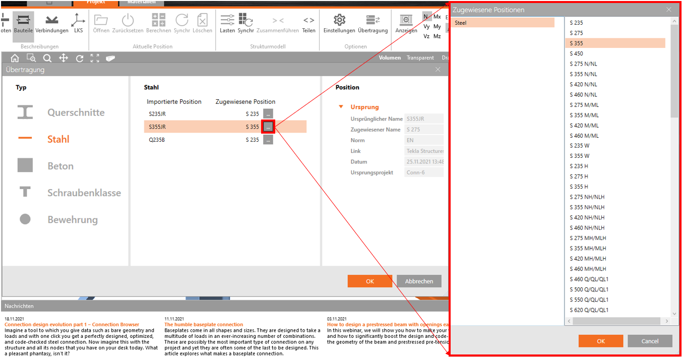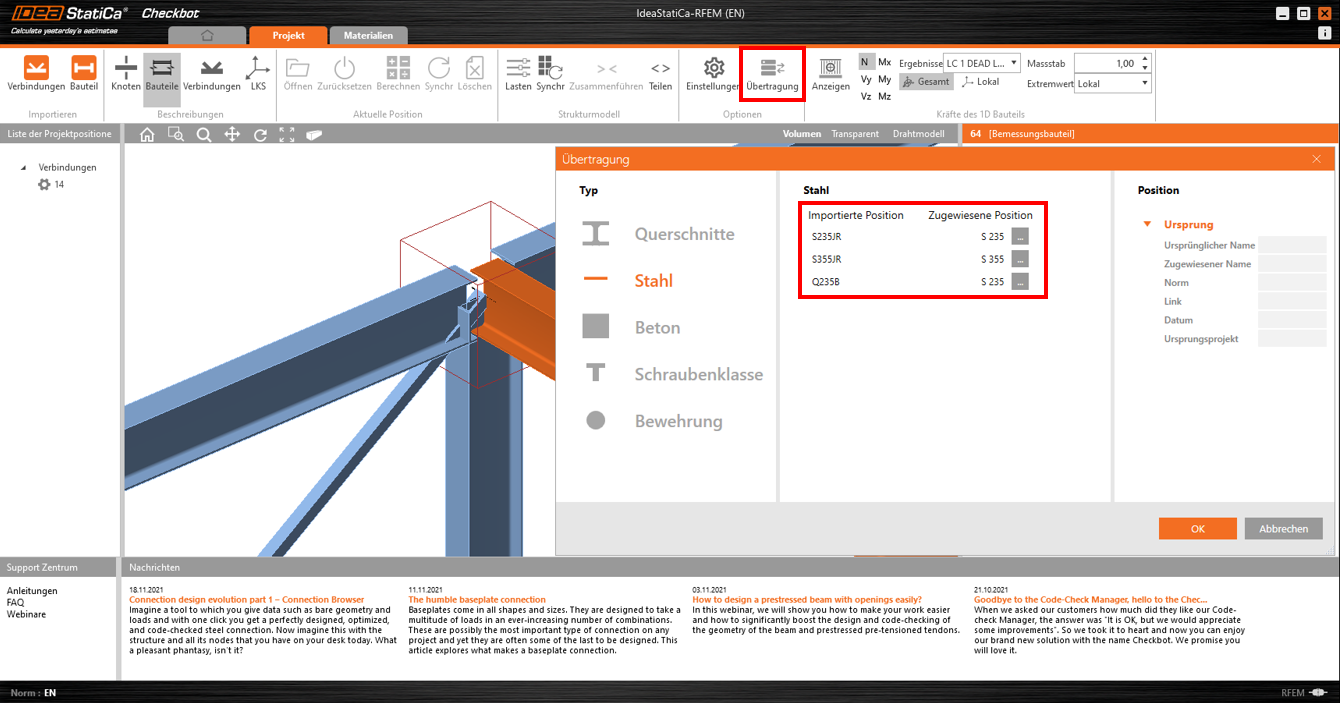 Unter Importierte Position können Sie das ursprüngliche Material des Bauteils einsehen. Unter Zugewiesene Position wird das Material aufgeführt, dass in IDEA StatiCa anstatt des unter Importierte Position genannten Materials verwendet wird. In diesem Beispiel die Stahlklassen S235JR, S355JR und Q235B nicht in der Materialbibliothek vorhanden, daher wird vom Programm automatisch S235 bzw. S355 ausgewählt und zugewiesen.