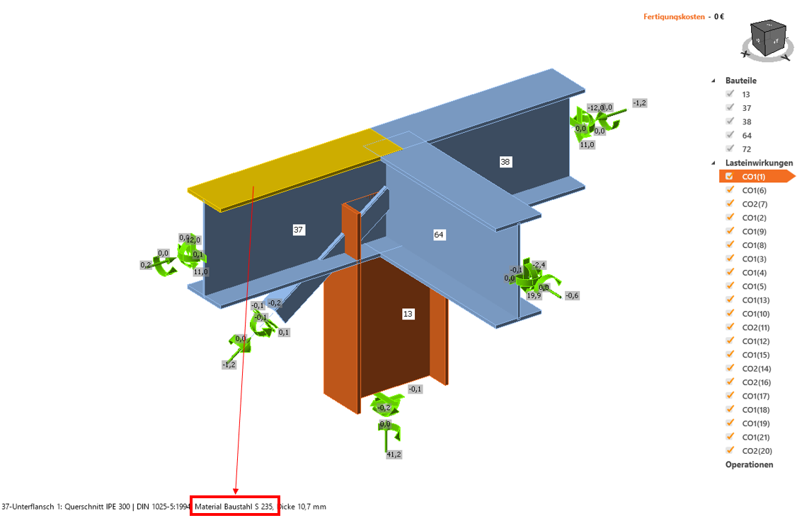 Wenn Sie die Verbindung in IDEA Connection öffnen und mit der Maus über eine Verbindungskomponente fahren, wird in der linken unteren Ecke der 3D-Darstellung u.a. das für diese Komponente eingestellte Material angezeigt
