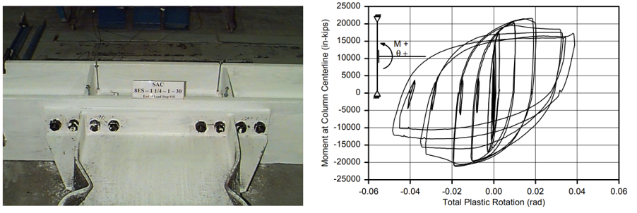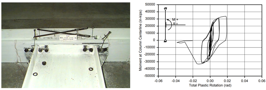 Figure 2.4: Left) Baseline model after testing; Right) moment-total plastic rotation relationship (Sumner et al., 2000)