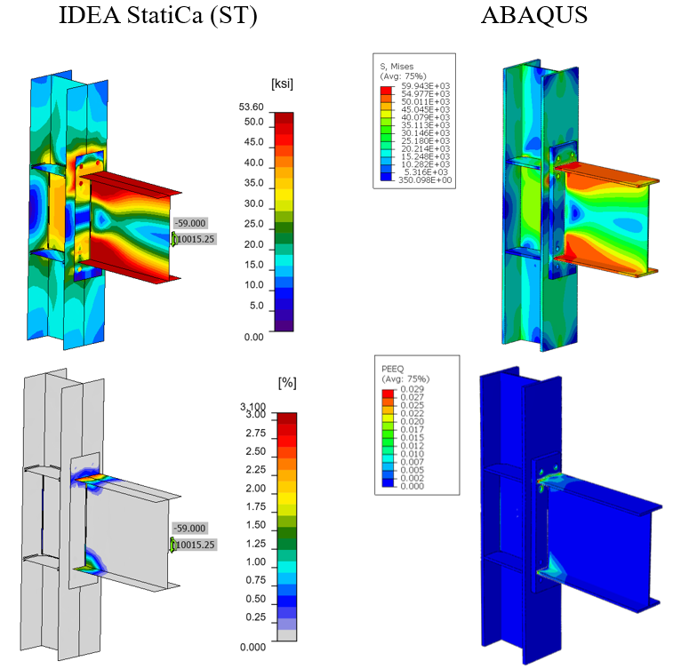 Figure 2.20: Comparison of the predicted von Mises stress (top row) and plastic strain (bottom row) between IDEA StatiCa and ABAQUS models