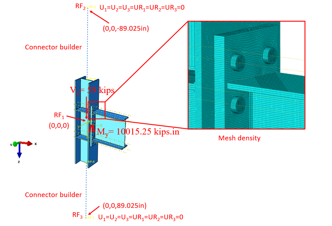 In this section, the baseline model developed in Section 2.4.1 was constructed again using ABAQUS software (version 2022) and results were compared with IDEA StatiCa. The CAD model for the finite element analysis was generated using the IDEA StatiCa’s viewer platform. The eight bolts and all 26 weld lines in four different lengths were then added to the assembly using the CAD interface in ABAQUS. The same vertical load of 59 kips and the corresponding moment of 100,15.25 kips-in. (around Y axis) were applied to a defined reference point (i.e., RF1) as shown in Figure 2.19. The analytical length of the column in IDEA StatiCa was 178.05 in. Therefore, to mimic the identical column length in ABAQUS, two other reference points (i.e., RF2 and RF3) were introduced 89.025 in. away from the center of the column along the Z axis in both directions (see Figure 2.19). These two reference points were fixed in all directions and were connected to the top and bottom faces of the column using a connector builder module in ABAQUS. In ABAQUS, the element size was chosen to be between 2.5-5 mm after mesh sensitivity analysis. The 3D stress, 8-node linear brick reduced integration (i.e., C3D8R ) element type was selected.
