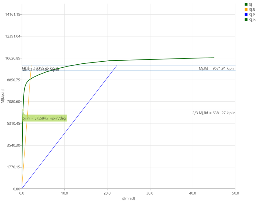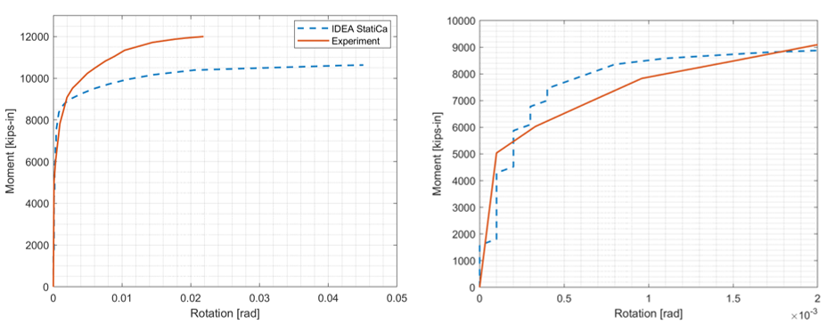 The connection of the baseline model was designed to develop 110% of the plastic moment capacity of the beam. As expected, it was reported that severe flange buckling occurred in the beam (Figure 2.4). Similarly, IDEA StatiCa and code-based design calculations identified the same failure mode. The moment capacity corresponding to 5% of the plastic strain limit computed by IDEA StatiCa is slightly less than the moment strength of the beam calculated following the AISC procedure (9,969 kips-in. versus 10,216 kips-in. in Figure 2.22). Also, the moment-rotation comparison was performed for the baseline model. The moment-plastic rotation curve was extracted from the test report and compared with the one provided by IDEA StatiCa as shown in Figure 2.23.