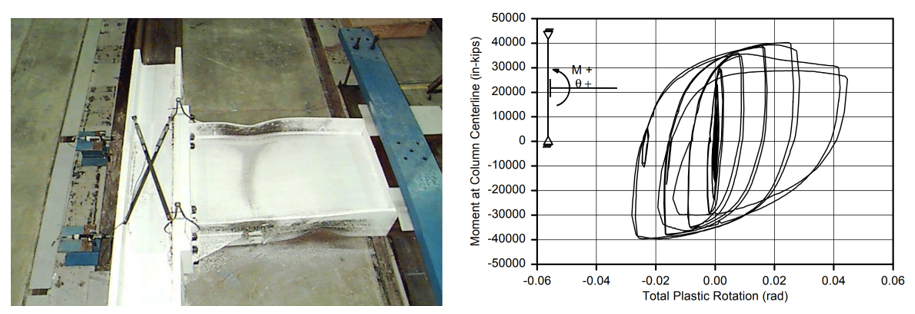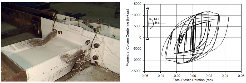 The baseline model was designed to develop 110% of the nominal plastic moment capacity of the beam (, where  is yield stress and  is the plastic section modulus of beam). During testing, initial yielding occurred in the web and both flanges of the beam, and severe local buckling of the beam was observed during further cycles (Figure 2.4).