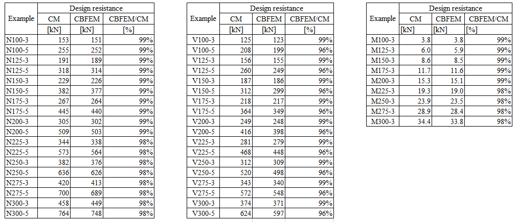 To illustrate the accuracy of the CBFEM model, the results of the parametric studies are summarized in a diagram comparing the design resistances of CBFEM and CM; see Fig. 4.3.5. The results show that the difference between the two calculation methods is in all cases less than 10 %.