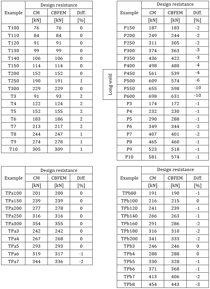 Design weld resistance calculated by CBFEM is compared with the results of CM. The results are presented in Tab. 4.1.2. The study is performed for two parameters, length of the weld and effective throat thickness, in three weld configurations: for the transverse weld, parallel welds, and a combination of transverse and parallel welds.
