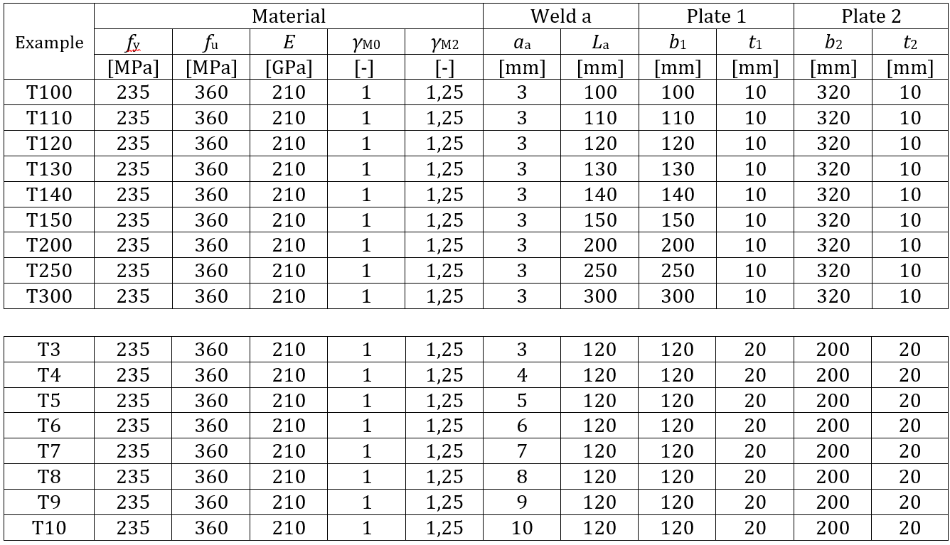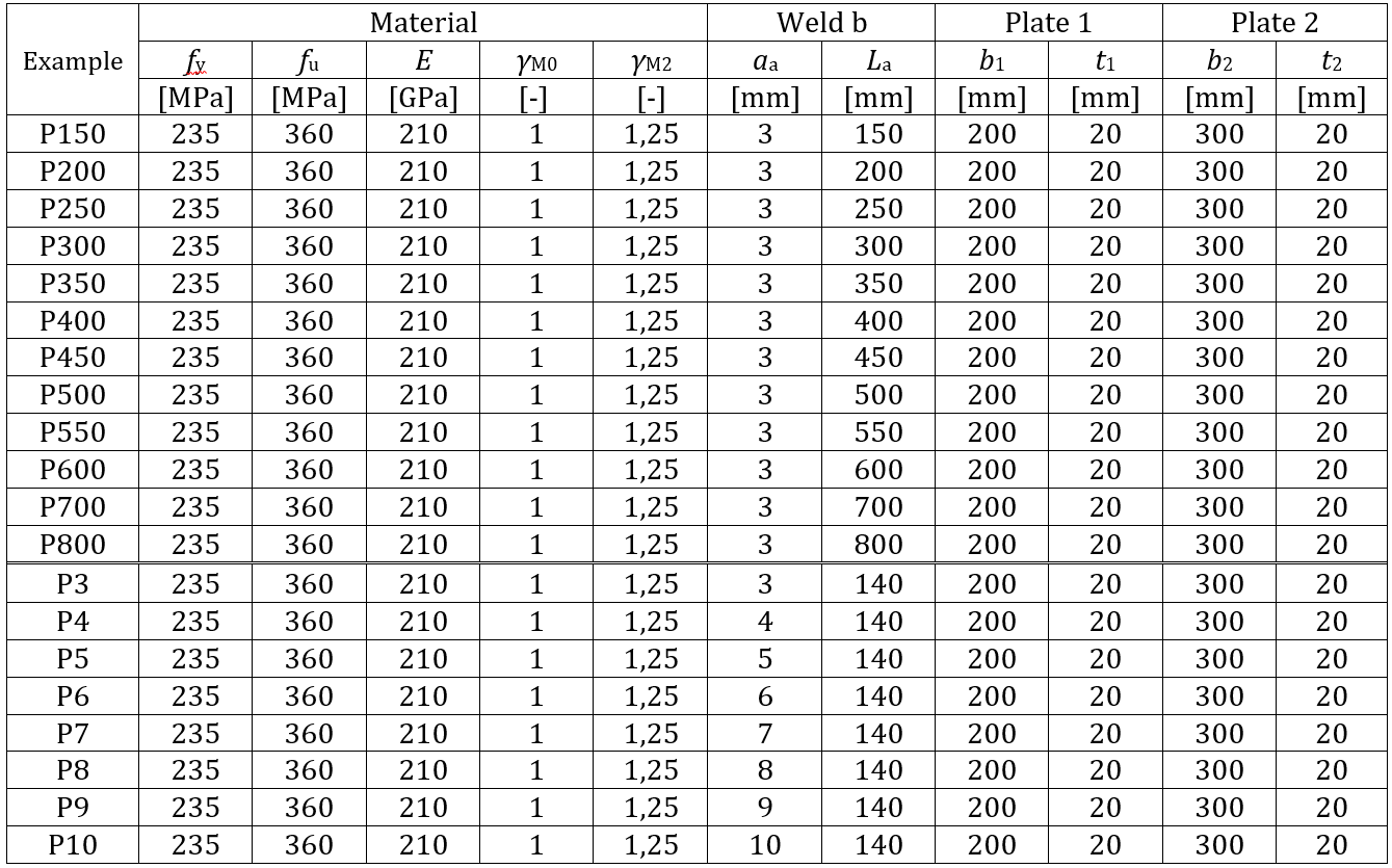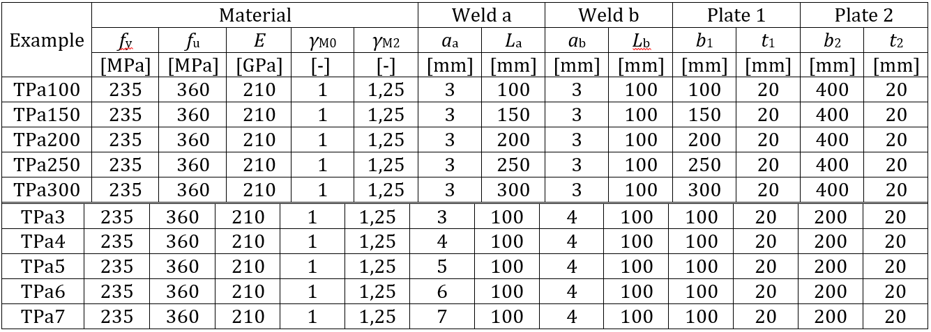Overview of the considered examples and the material properties is given in Tab. 4.1.1. The weld configurations T is for transverse, P for parallel weld, and TP for a combination of both; see the geometry in Fig. 4.1.2. The sensitivity of two parameters, weld length and effective throat thickness, was investigated.