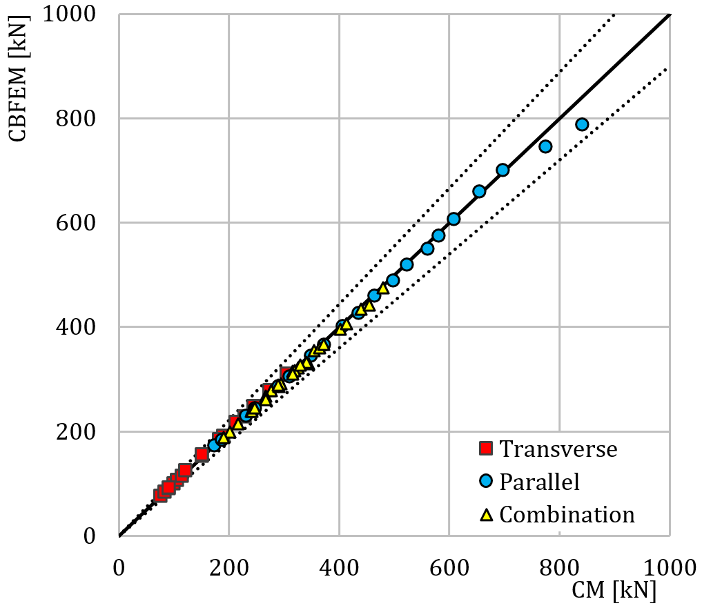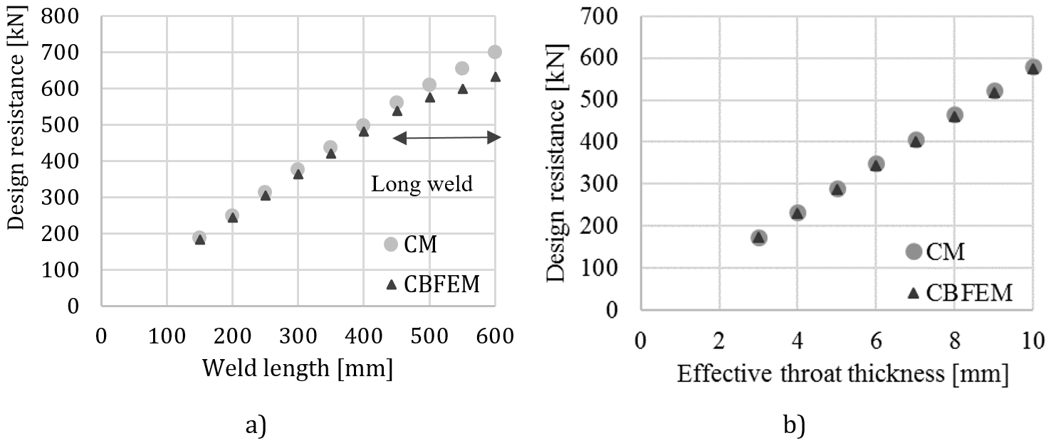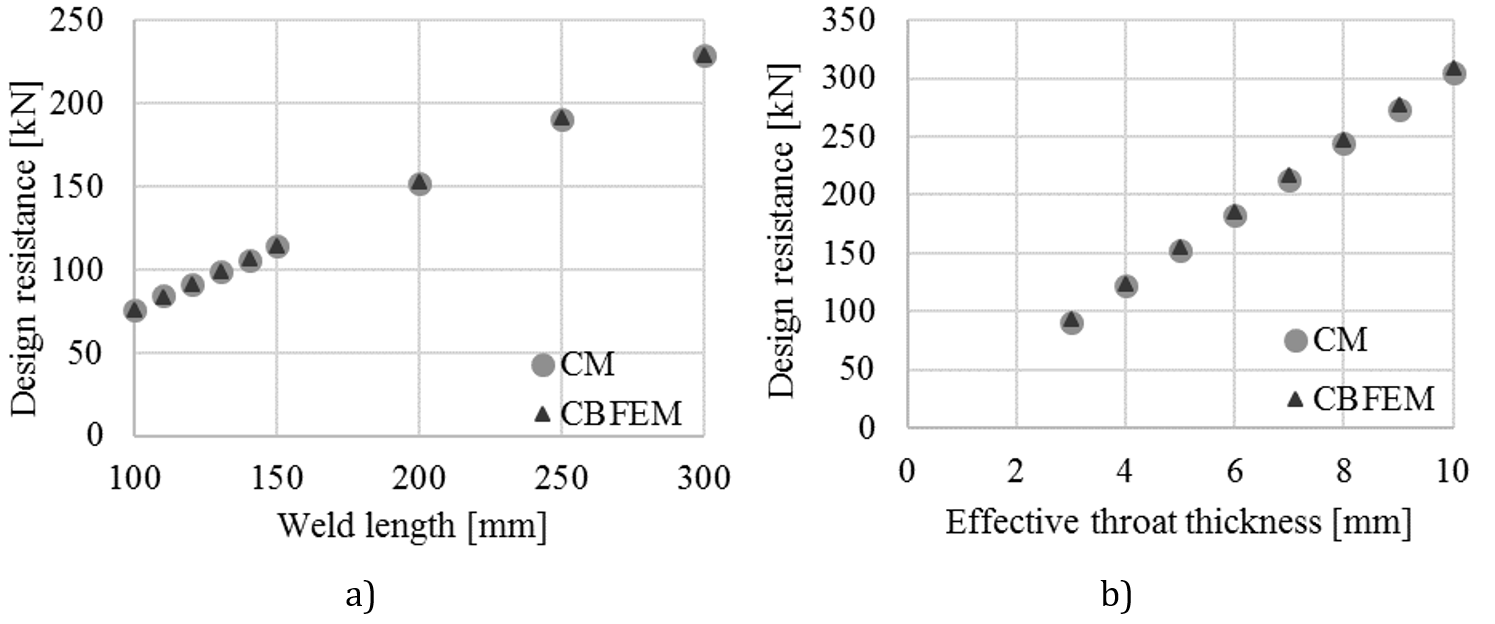 Results of CBFEM and CM are compared, and a sensitivity study is presented. The influence of weld length and effective throat thickness on the design resistance of the transverse weld, parallel welds, and a combination of both welds is shown in Fig. 4.1.3, 4.1.4, and 4.1.5, respectively. The sensitivity study shows good agreement for all weld configurations.
