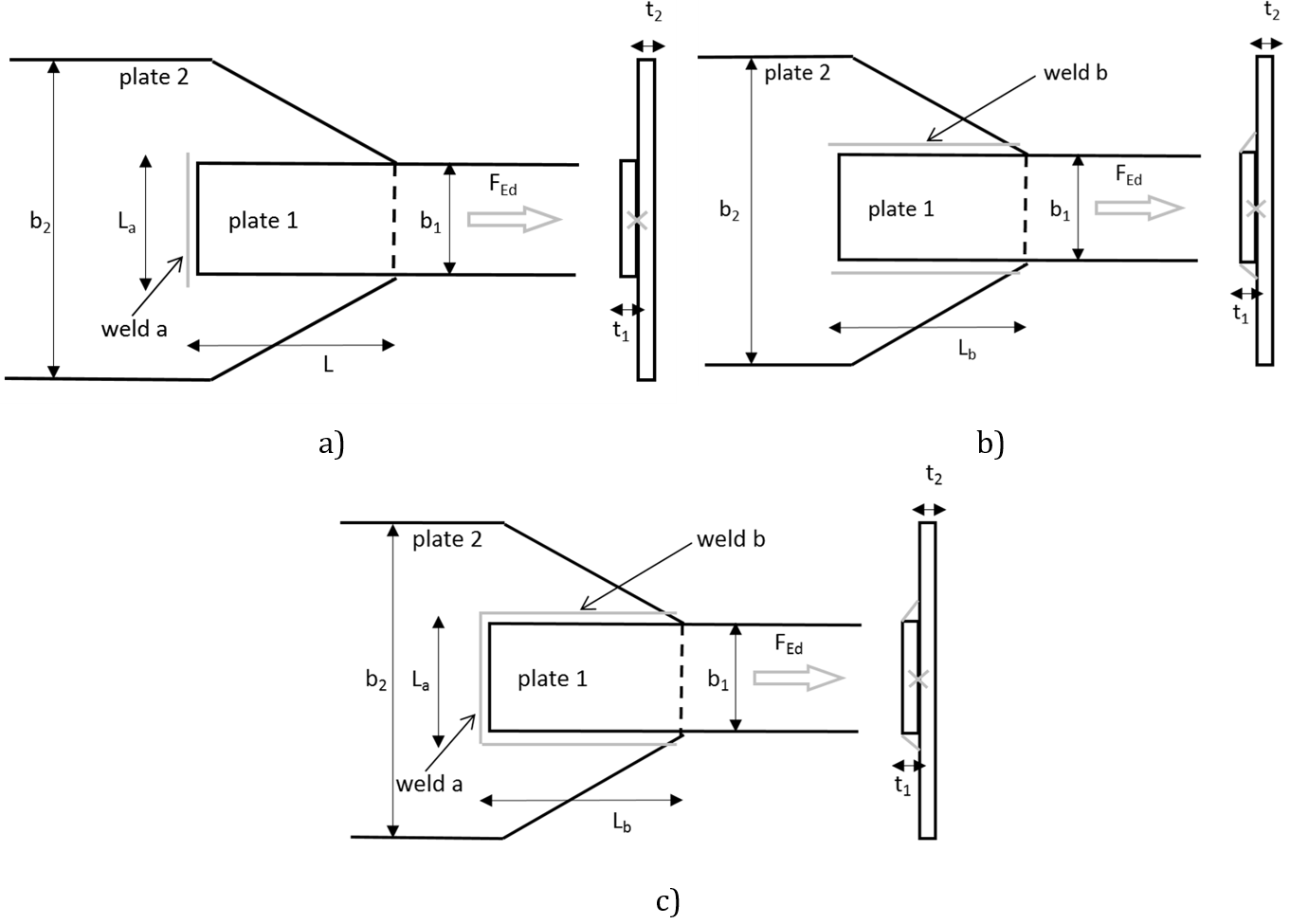 Fig 4.1.2 Joint geometry with dimensions: a) Transverse weld b) Parallel weld c) Combination of transverse and parallel weld