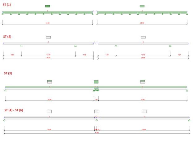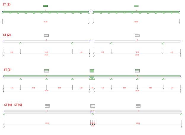 Static scheme changes in time. For each case, various support layout is considered. The construction process is identical, though. Precast beam fabrication, storage yard, precast beam mounting on the temporary supports at the site, and consequent compositing with cast-in-situ slab and diaphragm. The position of final supports is the same for both cases, as well as the history of loads.