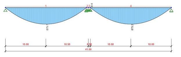 The user has to specify the cross-section parameters corresponding to the stage either before or after compositing the precast concrete beams with the reinforced concrete cast-in-situ slab, for each part of the cross-section separately. Whereas in IDEA StatiCa Beam the stage before compositing is taken into account, i.e. the circumference of the drying part of the section corresponds to the circumference of the whole cross-section of the precast beam, and after compositing. i.e. the circumference of the drying part of the precast beam is reduced by the length of the construction joint between the precast beam and the cast-in-situ slab. The rapid increase in bending moment over the middle (final) support is attributed to the chosen arrangement of temporary supports. It is the temporary supports that eliminate the effects of construction stages, and thus we obtain bending moment diagrams that are close to those of a structure as it would be built by a full staging method.