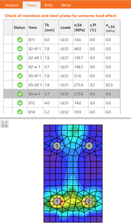Für jede Verbindung in Checkbot wird die nichtlineare Analyse über das Symbol Berechnen im oberen Bereich gestartet. Das Statikmodell wird automatisch generiert, die Berechnung durchgeführt und Sie können die Ergebnisse überprüfen. Den Gesamtnachweis sehen Sie direkt in der Tabelle im linken Teil der 3D-Darstellung.