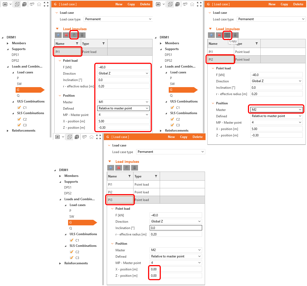 Set the Point load Pl1, and press the copy button. Then set the master member of the Point load Pl2 to M2 and again click on the copy. Pl3 has to be moved to the middle of the span. Adjust the X and Y positions.