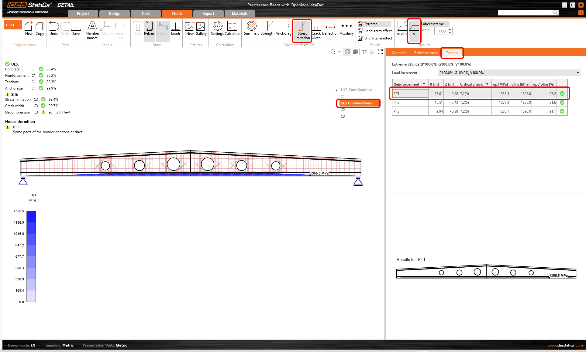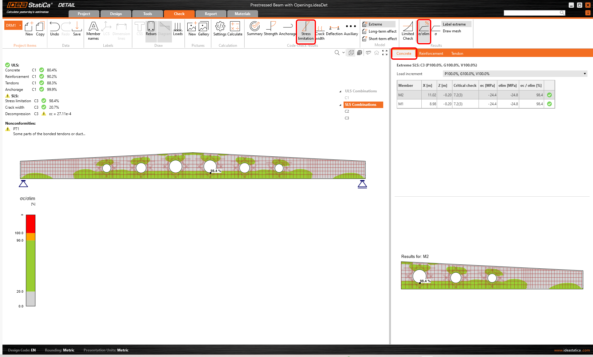 The results of SLS checks can be found in the Stress, Crack, and Deflection tab. For the Stress limitation state, the C2 combination was governed to check the concrete, while C3 to check the reinforcement tendons.
