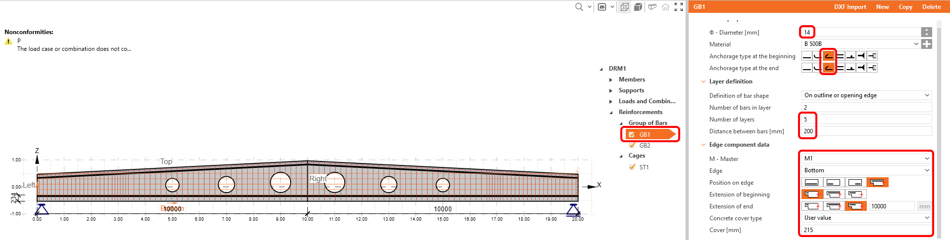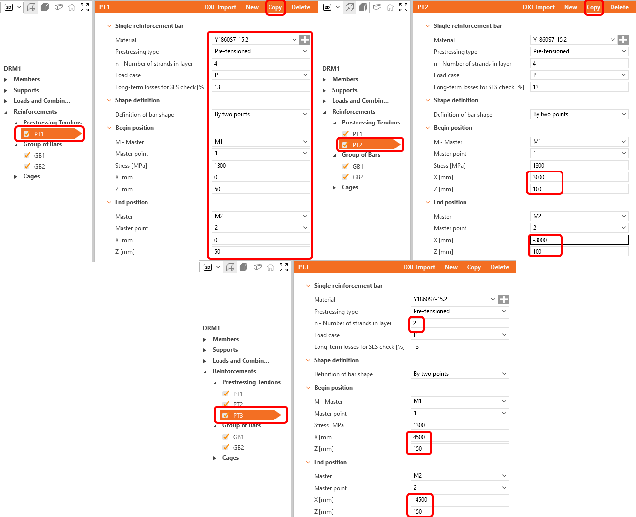 Select the proper cross-sections, and adjust the length and alignment. When the beam M1 is set, click on copy button to create the second part of the beam. Then modify the M2 beam.
