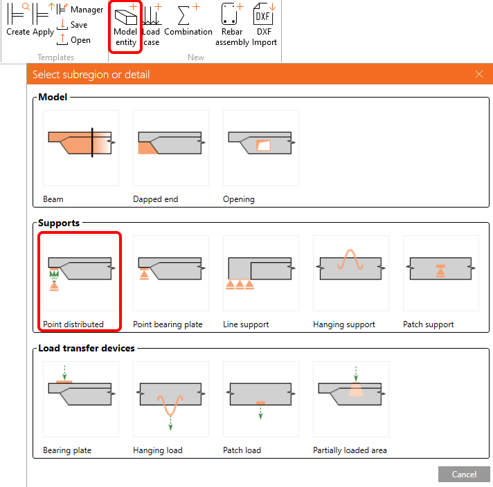 The Distributed point supports were chosen because of the possibility of using the Partially loaded areas. You can learn more by reading this article: Partially loaded areas. You can even add a reinforcement to the partially loaded areas. This option is omitted in this case. It is done by setting the distance between rebars greater than the height of the PLA.