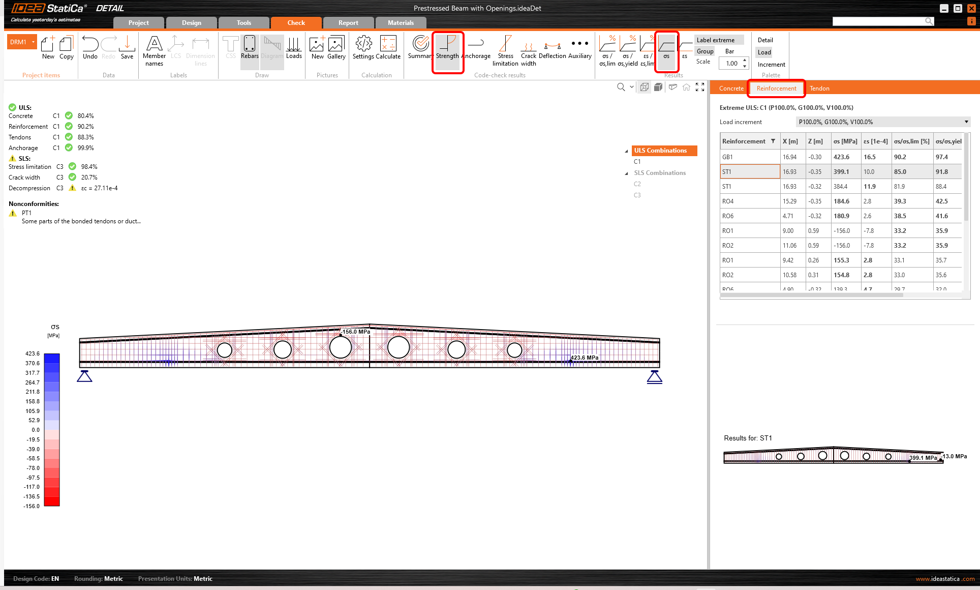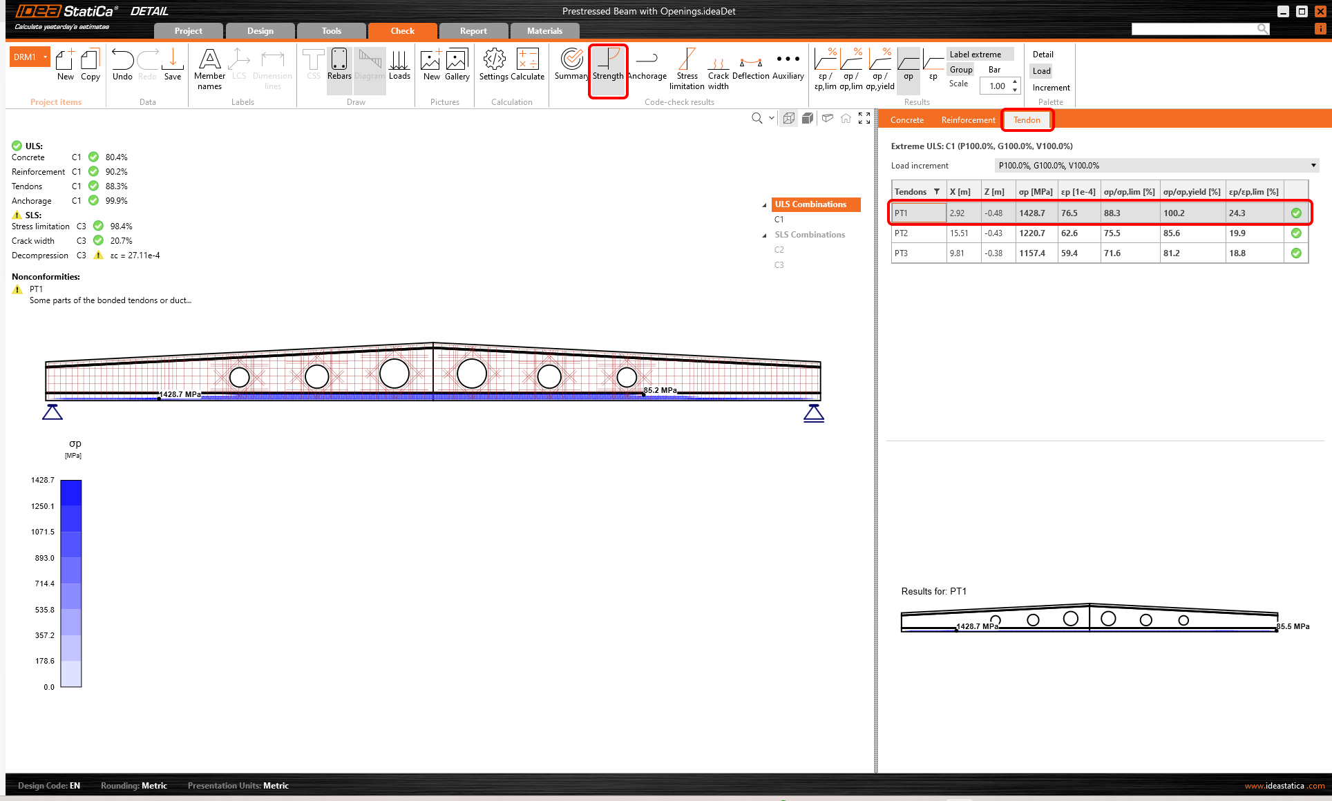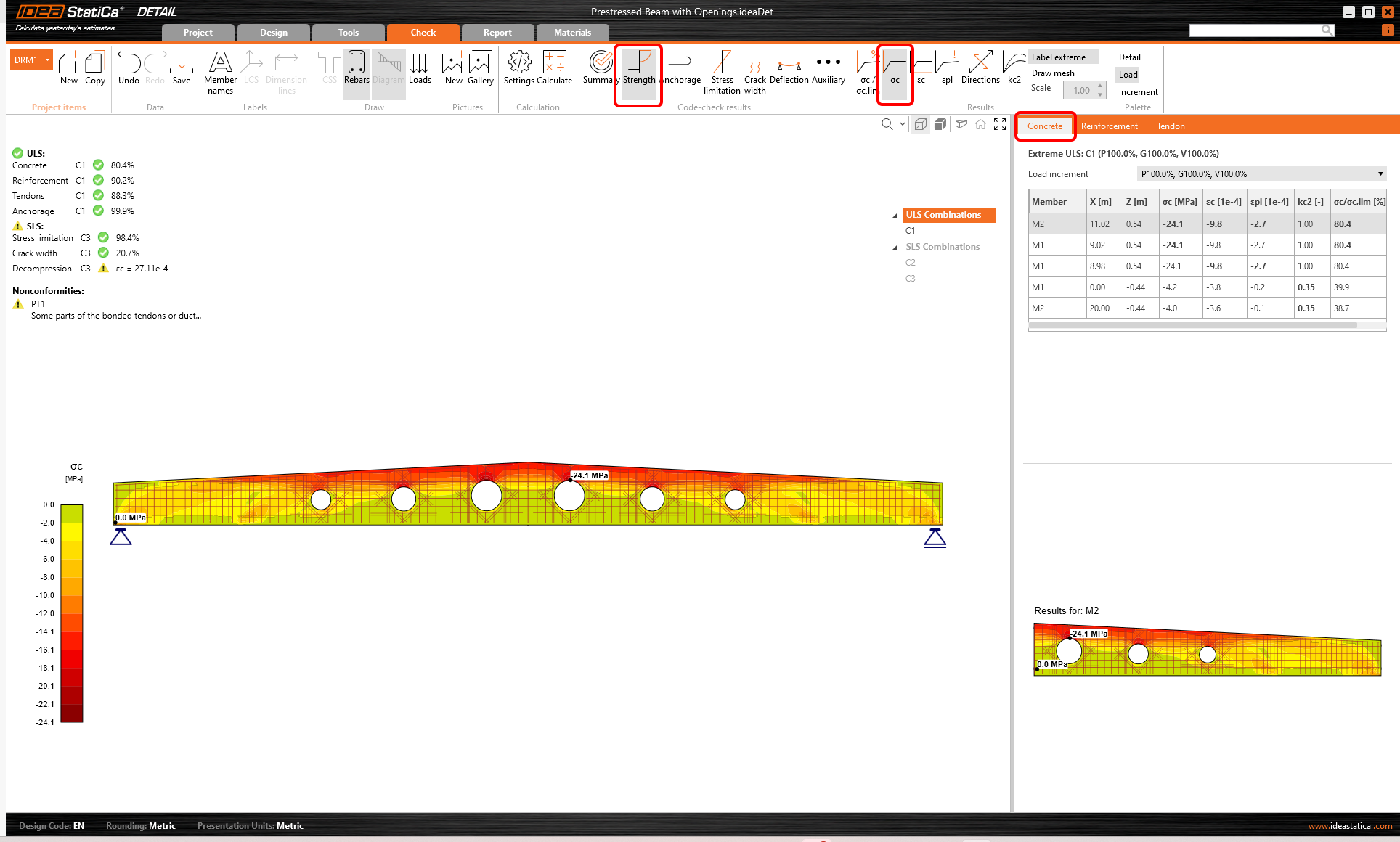 Start with click on the Strength tab. This will open concrete ULS checks such as utilization in stress, stresses in principal direction, strains, and also a map of reduction factor kc. The C1 combination was used to check ULS.