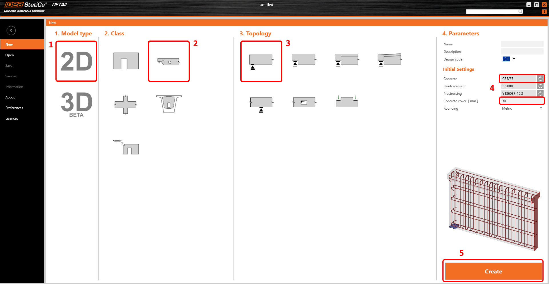 In the Discontinuity Region Wizard, set the concrete and reinforcement grade and define the Concrete cover thickness. Select the Beams template and End support.