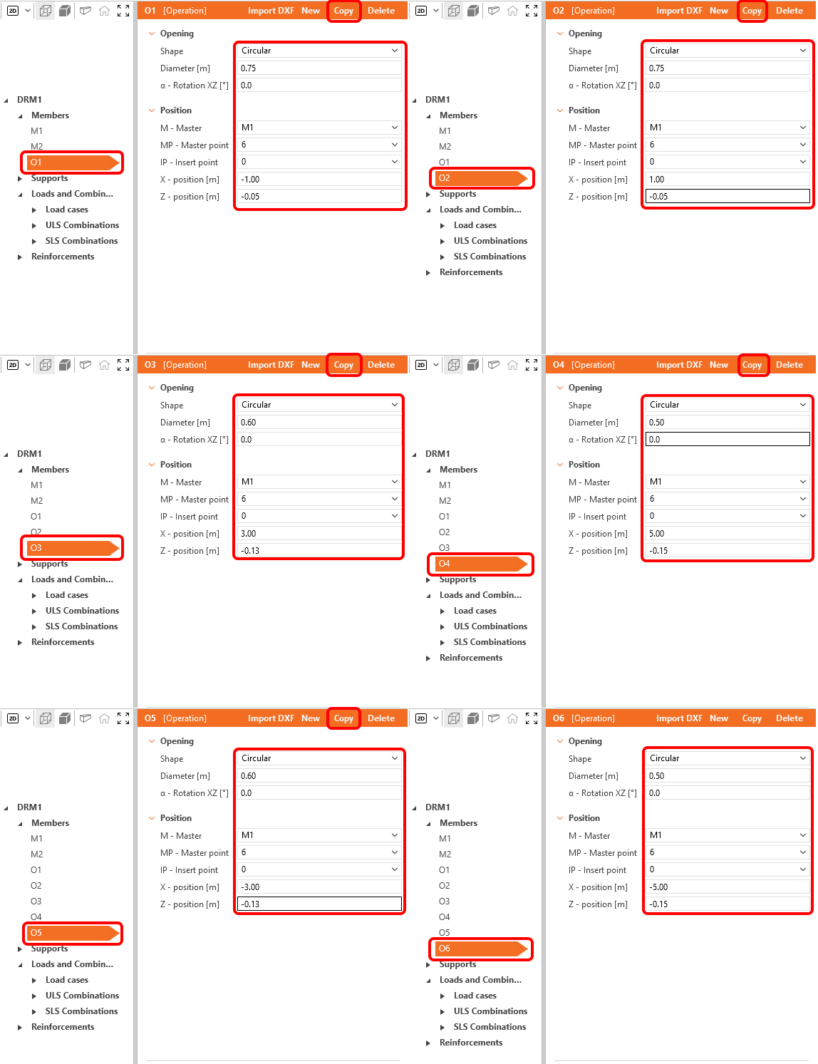Modify the geometry of the opening O1. Once you are done click on the copy button to create a new opening O2. Then proceed in the same way with the other openings. You can see the geometry settings below.