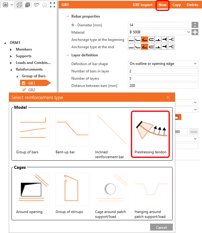 Simply click on the plus button and choose Prestressing tendon to create the first group of wires.