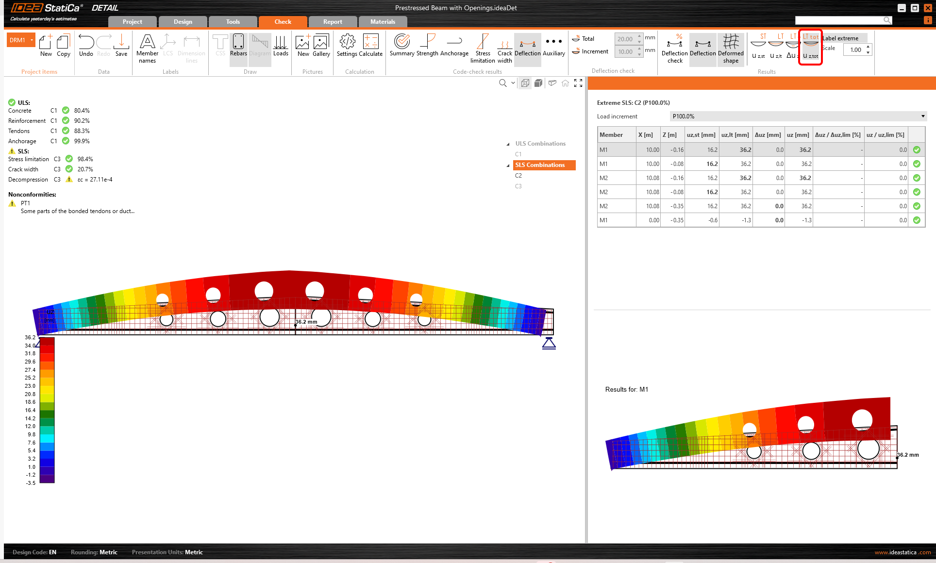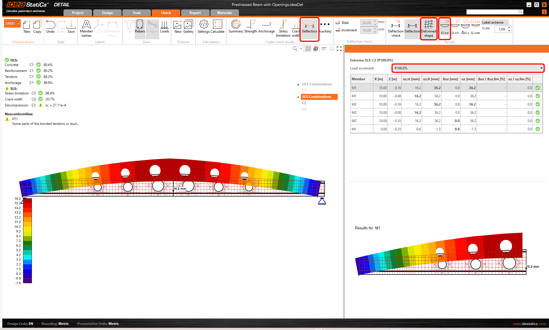 Last but not least, see the Deflection check. Deflections are available for quasi-permanent combinations. If you want to check deformations for 100% of the variable loads, you will have to create a quasi-permanent combination with a full variable load. In this case, the C3 combination includes only 20% of variable loads.