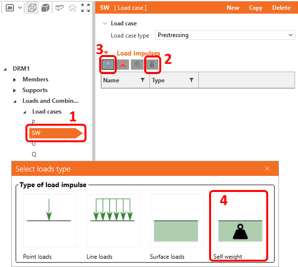 Toggle the Current load case to SW. Delete all loads in this case. Click on the plus button and apply the Self-weight.