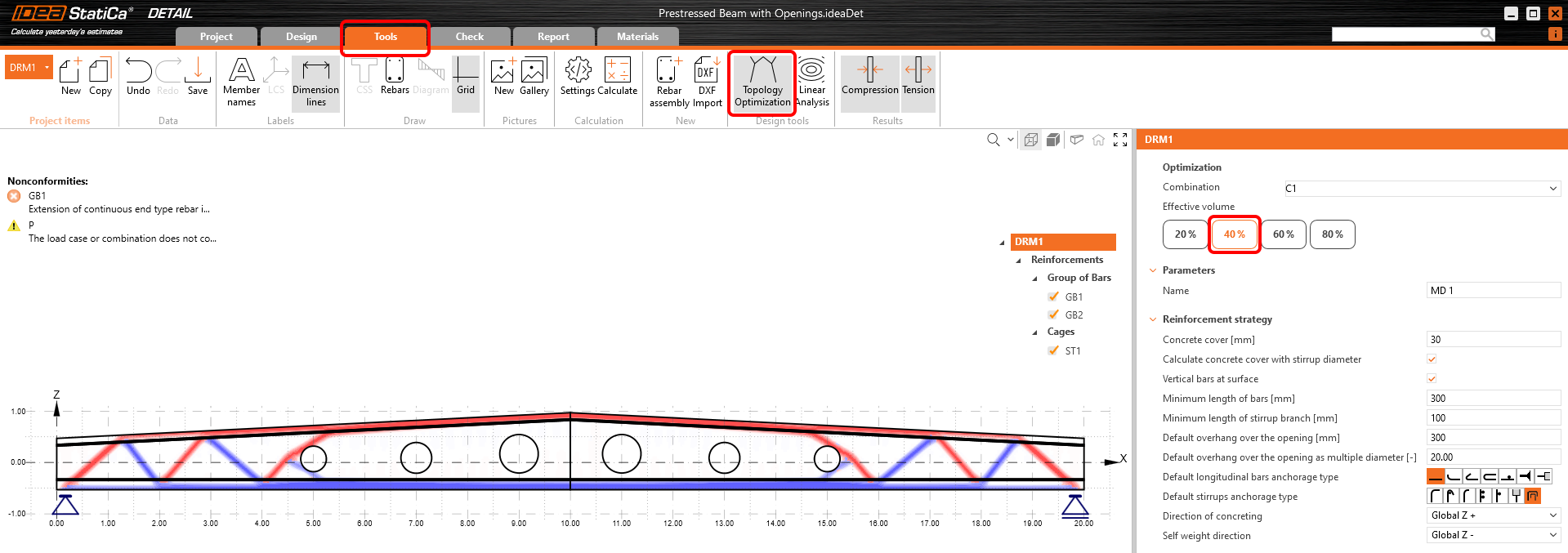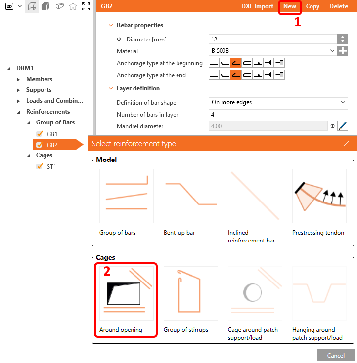 Last but not least reinforcement to be placed are the additional bars around the openings. Simply click on the plus button and select the Cages Around opening.
