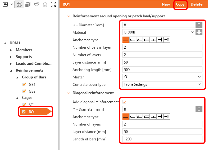 There are six openings, so you have to create six items of Reinforcement around the opening. All of them will be the same, only the M - Master has to be changed. First, modify the RO1 as follows.