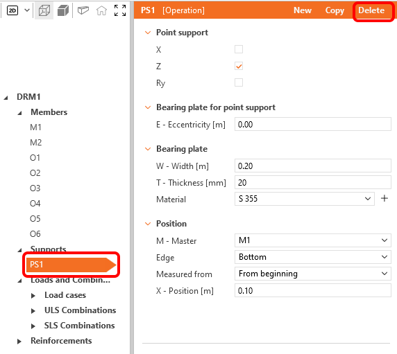 The last items to update in the Geometry tab are supports. There are several types of supports in the Detail application. Delete Point support PS1 which was created by the template.