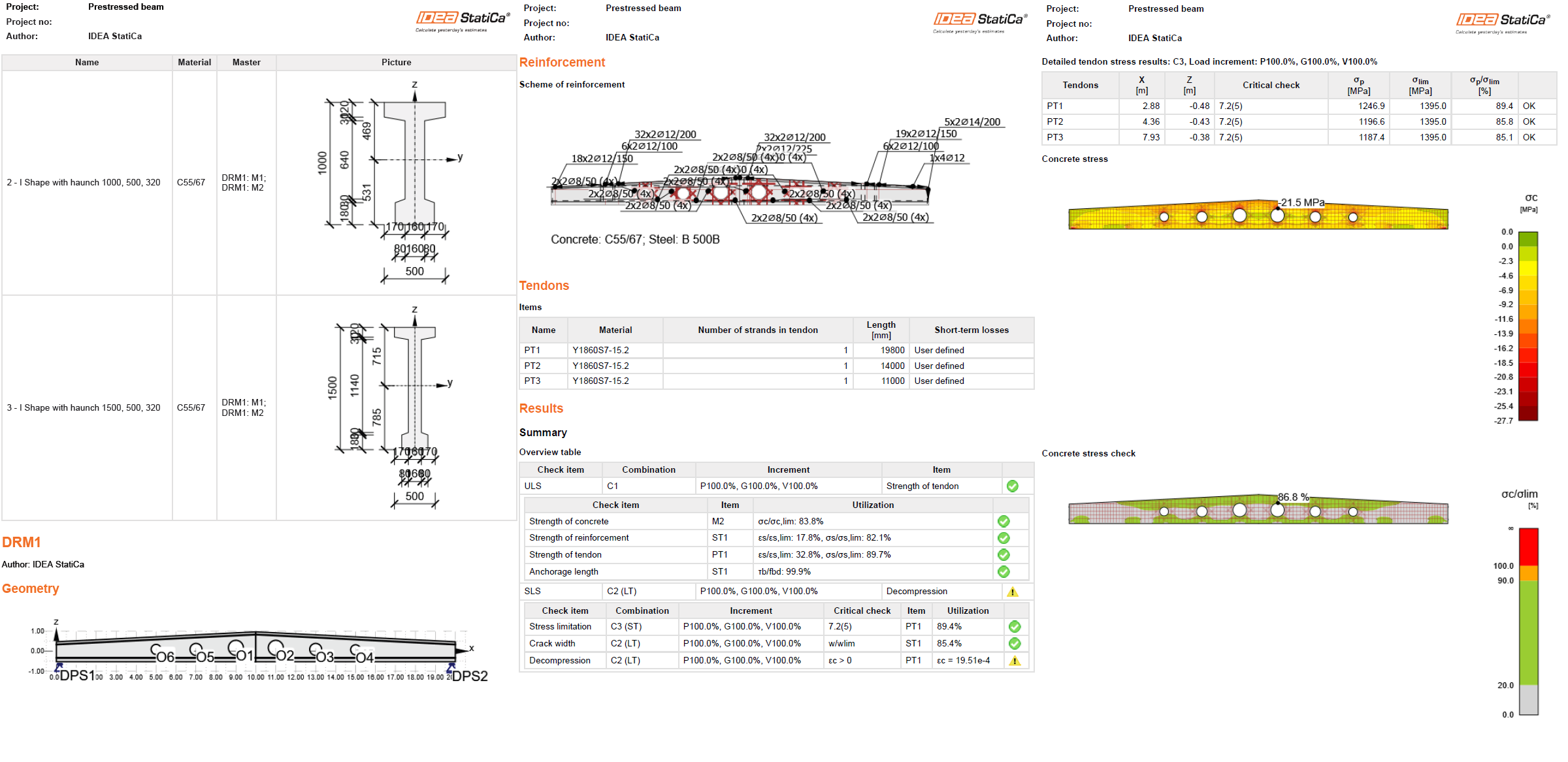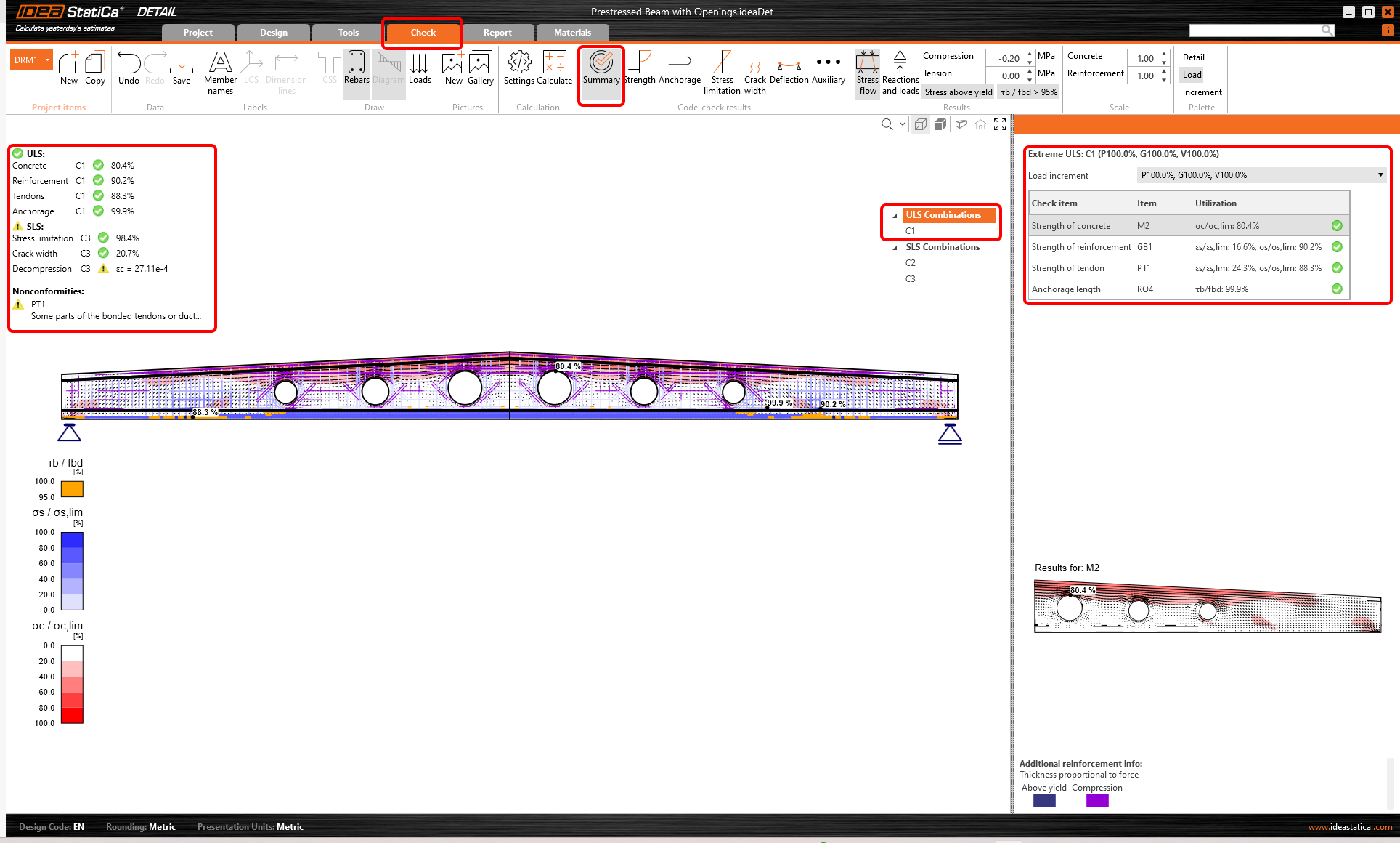 In the data window at the bottom, all detailed results can be found. Now the strength check of the concrete in ULS combination (C1) is presented. You can notice the portion of applied Prestressing, Permanent, and Variable load (P100%, G100%, V100%.)